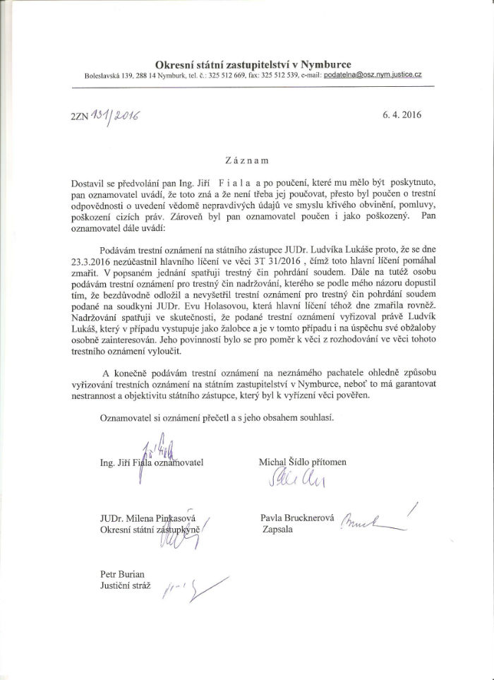 Na vedoucí státní zástupkyni OSZ v NB Milenu Pinkasovou jsme sice museli přes půl hodiny čekat, až se uvolí přijít s námi trestní oznámení sepsat, ale - dočkali jsme se ...