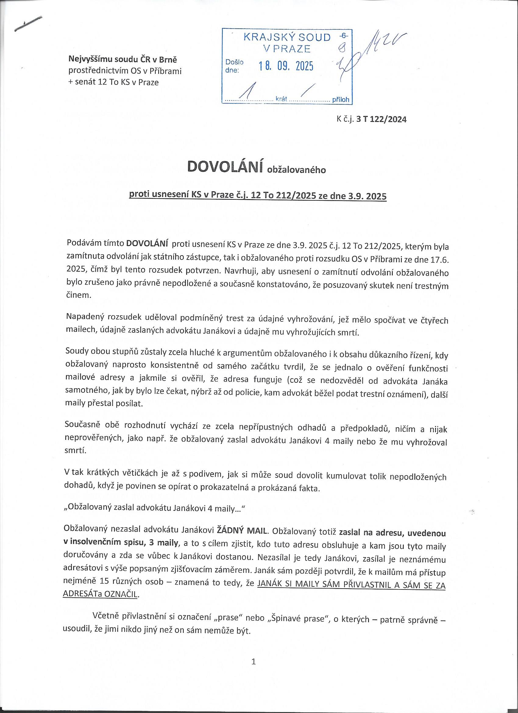 Především : Obžalovaný se k autorství tří (nikoliv čtyř) mailů sice přiznal, resp. je nikdy nepopíral - ale současně od začátiku tvrdil, že šlo pouze a výhradně o ověření funkčnosti mailové adresy. Tedy jestli maily tam odeslané skutečně doputují k advokátu Janákovi.
