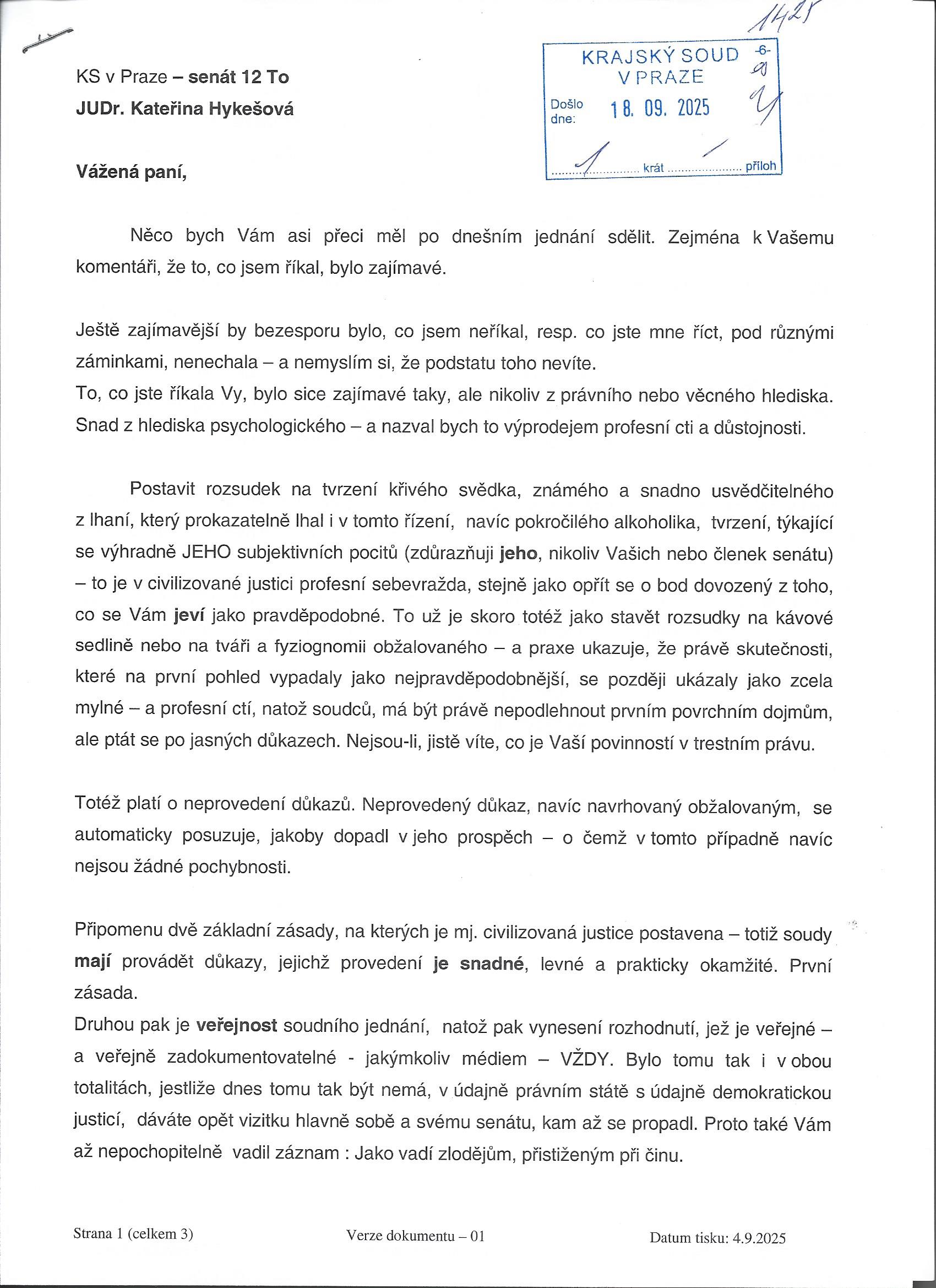 U soudkyně Hykešové je to navíc o to závažnější, že ani neváhala popřít své vlastní, rok staré rozhodnutí v obdobné kauze z OS v Nymburce (č.j. 11 To 316/2024 ze dne 13.11. 2024), které jasně konstatovalo, že „nestačí pouze jakýsi pocit, že by o takové jednání jít mohlo, ale že musí i následovat konkrétní popis jednání, jež by k ublížení na zdraví mohlo vést. “