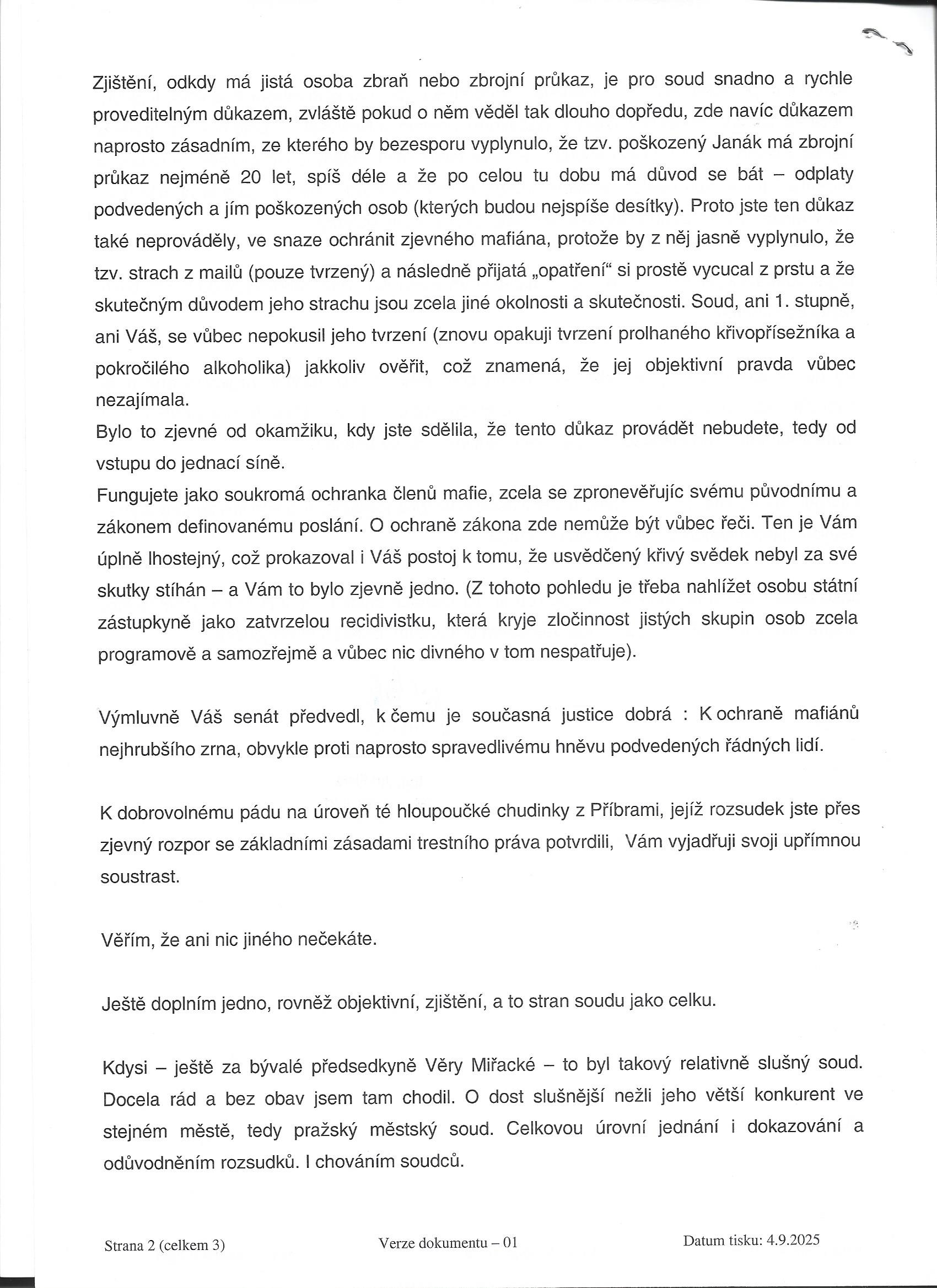 Za krajně urážlivé považuje obžalovaný už samu skutečnost, že jeho tvrzení jsou zpochybňována jako nevěrohodná, a to osobami, jež samy představují krajně nevěrohodné jedince, uvyklé celoživotní manipulaci jak s fakty, tak se zpracovávanými spisy, čehož právě tento případ je nejlepším důkazem.