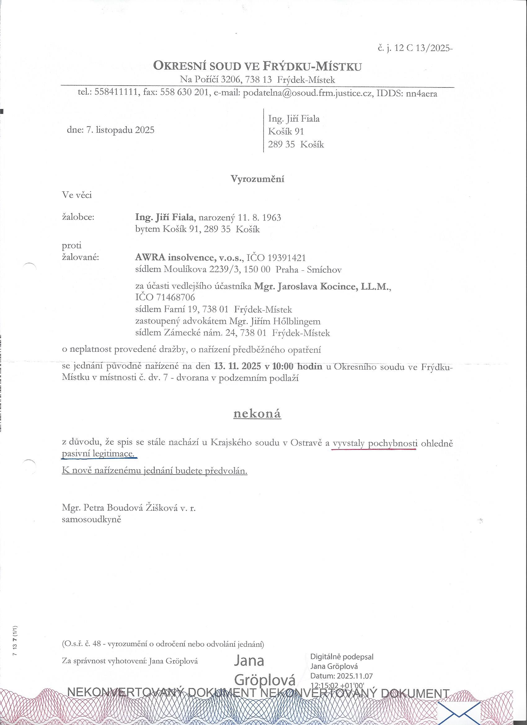 Z jejího vyjádření (v usnesení o odročení) jasně plyne, že věc leží na Krajském soudě v Ostravě - a ten pečlivě hledá sebemenší záminku, jak se věci elegantně zbavit. Samozřejmě bez toho, že by žalobci dali sebemíň zapravdu.