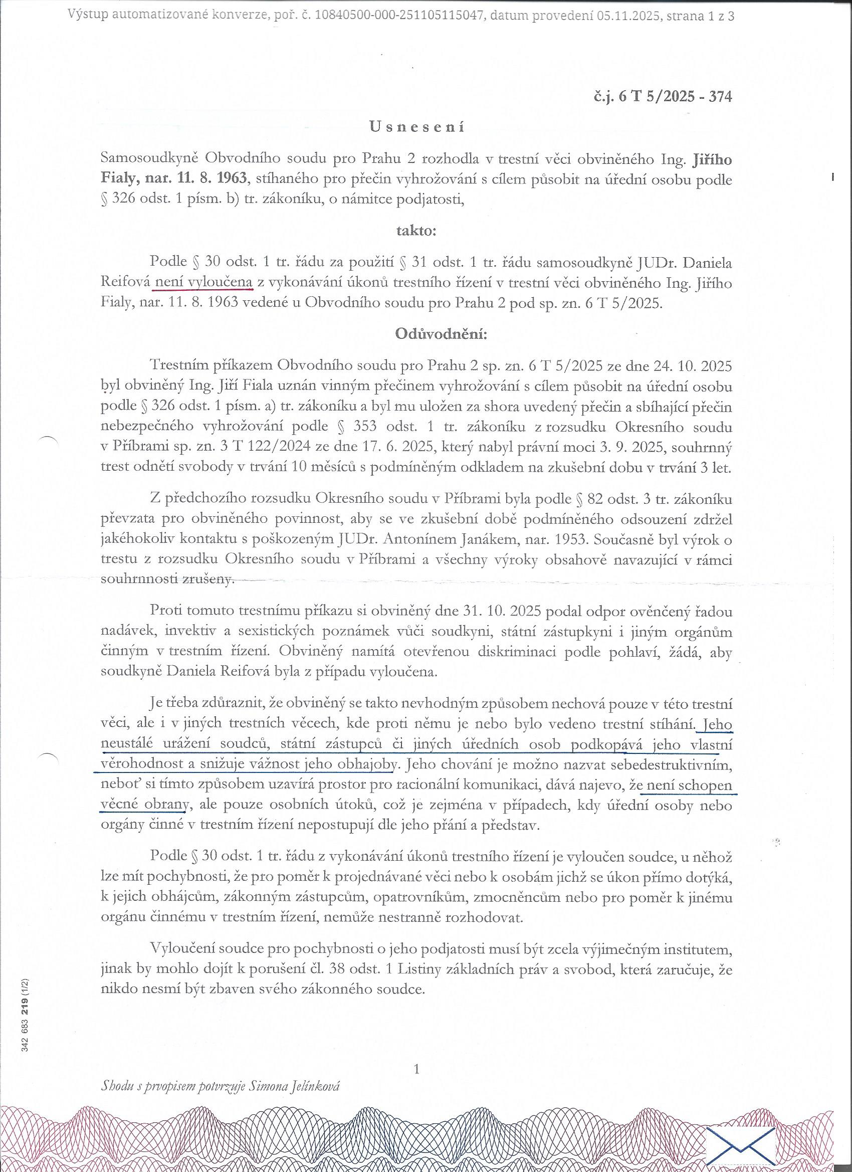 Současně obžalovaný konstatuje, že pokud mu přijde z MS usnesení zase dalších tří bab, považuje je automaticky za zmatečné a neplatné od samého počátku.