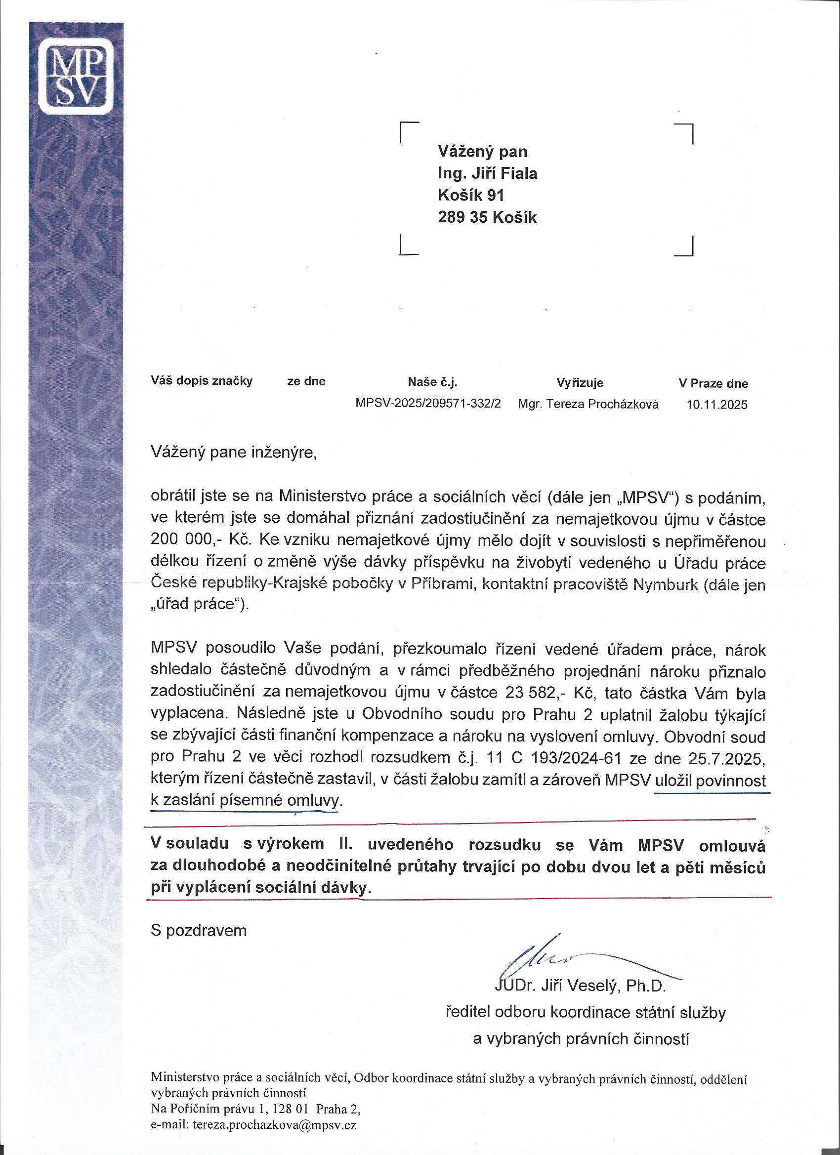 Už tady bylo sice pochybení dosti - na straně ÚP a MPSV - ale přeci jen šlo ještě rychle a snadno napravit. Vyplatit tisécovkku, omluvit se.