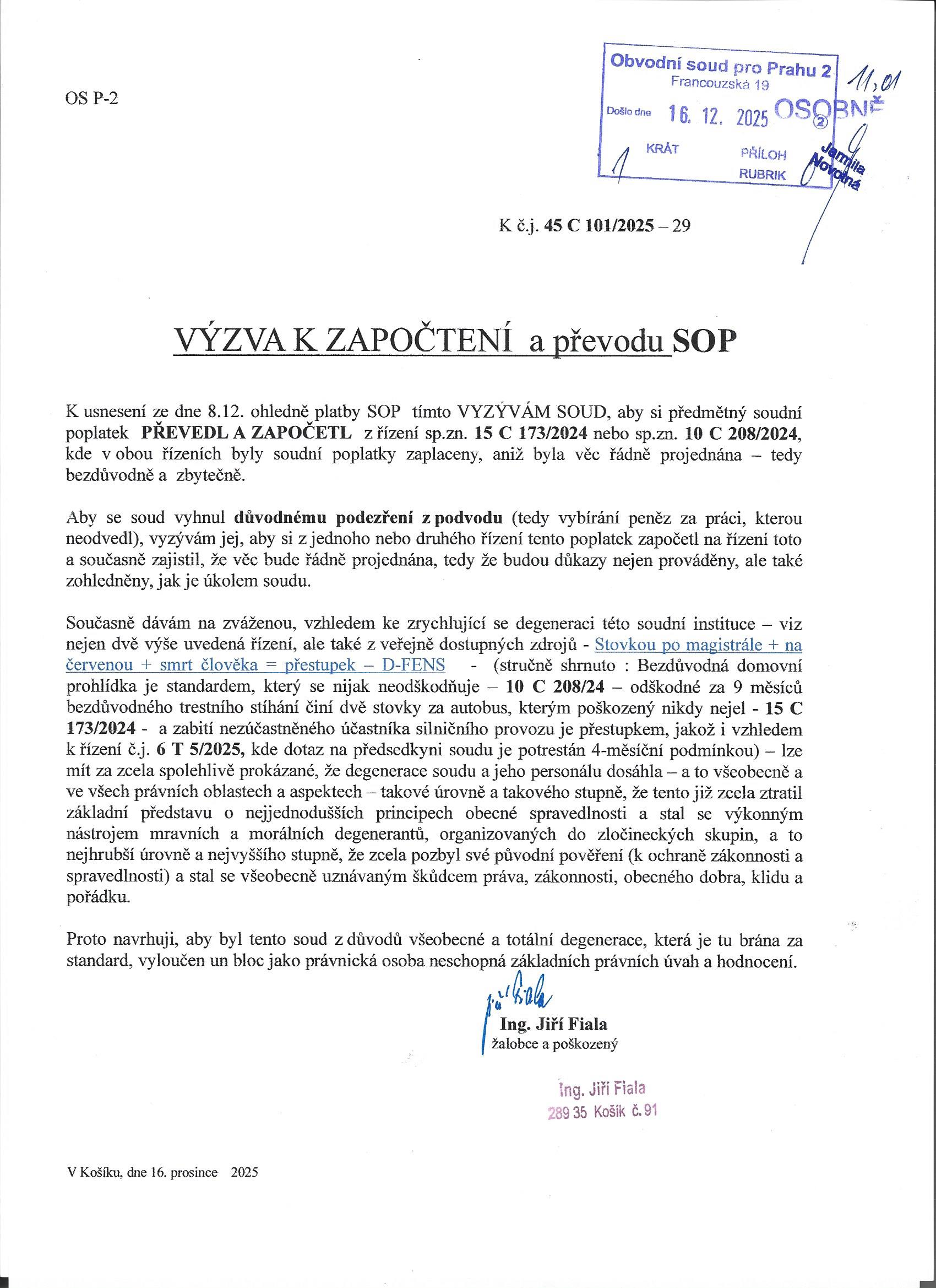 K usnesení ze dne 8.12. ohledně platby SOP tímto VYZÝVÁM SOUD, aby si předmětný soudní poplatek PŘEVEDL A ZAPOČETL z řízení sp.zn. 15 C 173/2024 nebo sp.zn. 10 C 208/2024, kde v obou řízeních byly soudní poplatky zaplaceny, aniž byla věc řádně projednána – tedy bezdůvodně a zbytečně.