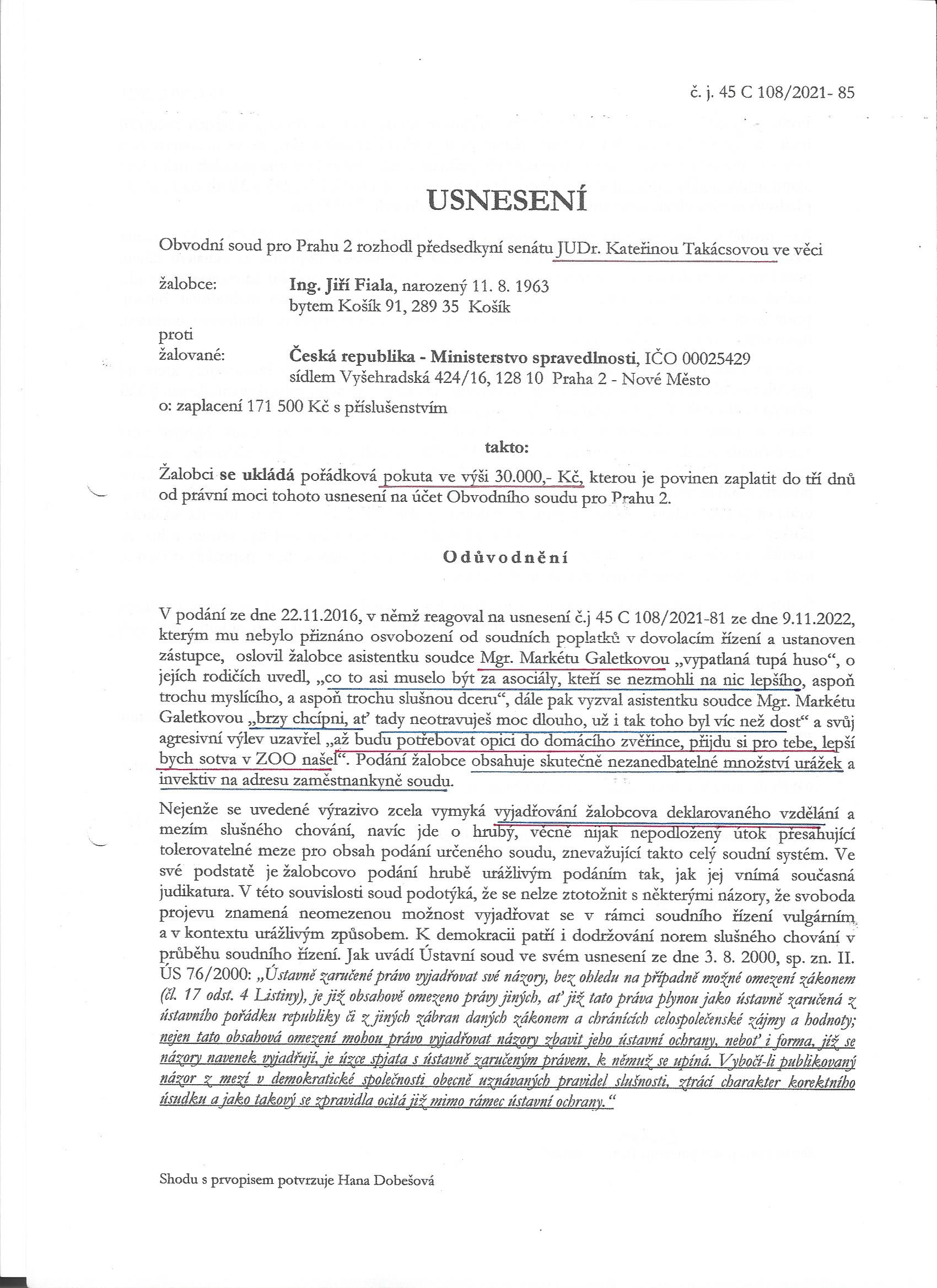 § Spis 45 C 108/21 – odškodné za bezdůvodné trestní stíhání v délce 1 roku, 3 jednání před soudem – odškodné nula – věc neprojednána, pokuta za vyjádření ke Galetkové 30.000,- Kč. Od této pokuty se věc přesně odvíjí až k Denemarkové. Soud to nezajímá – přestože Denemarková a její údajná škoda je předmětem řízení.