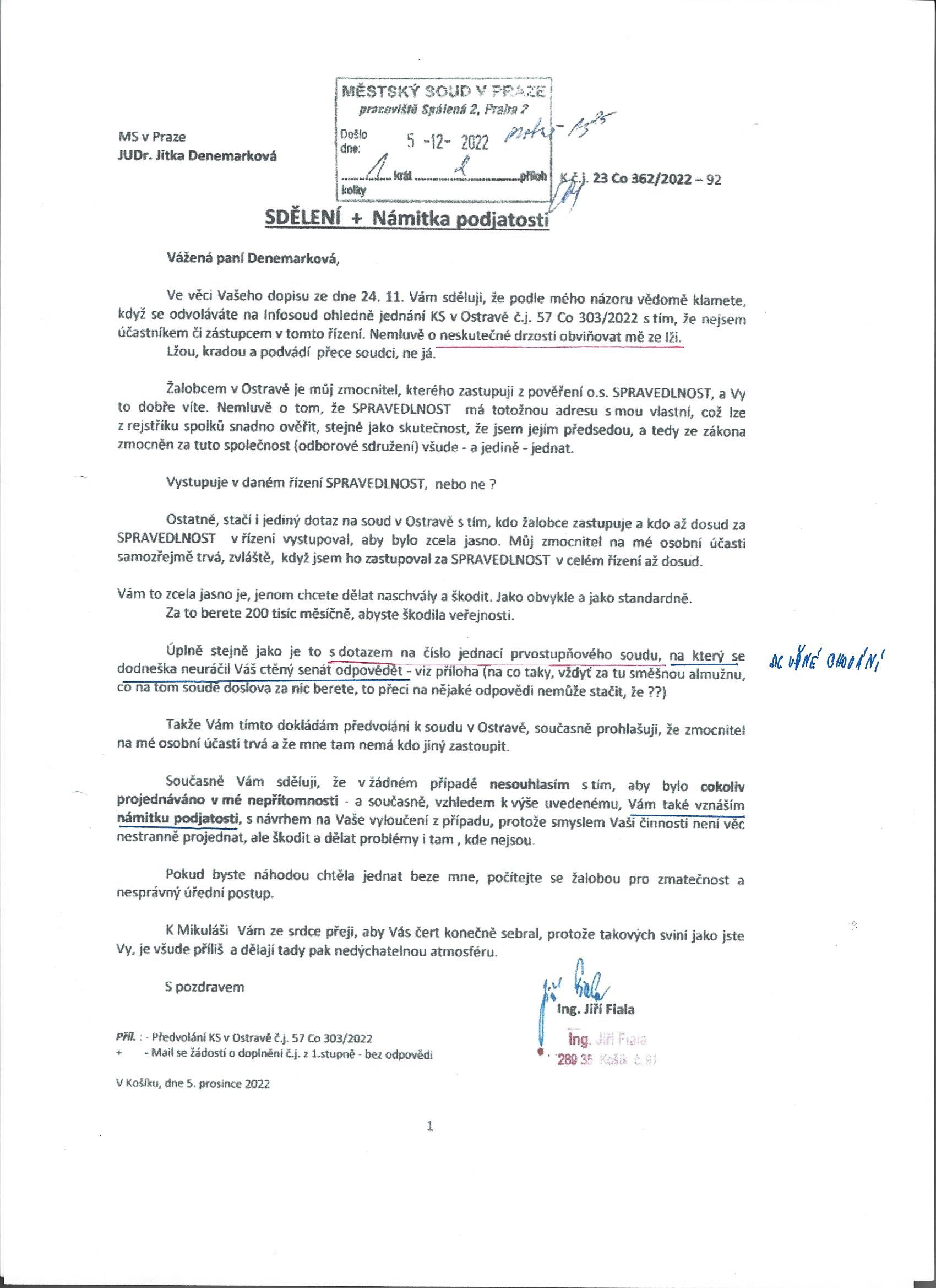 Dopis z 5.12.22 - tedy 1/4 roku před předmětným dopisem. Tak hrozně se vyhýbá obžalovanému, který je psychopat - že se nevyloučí ani při jasně formulované námítce podjatosti...