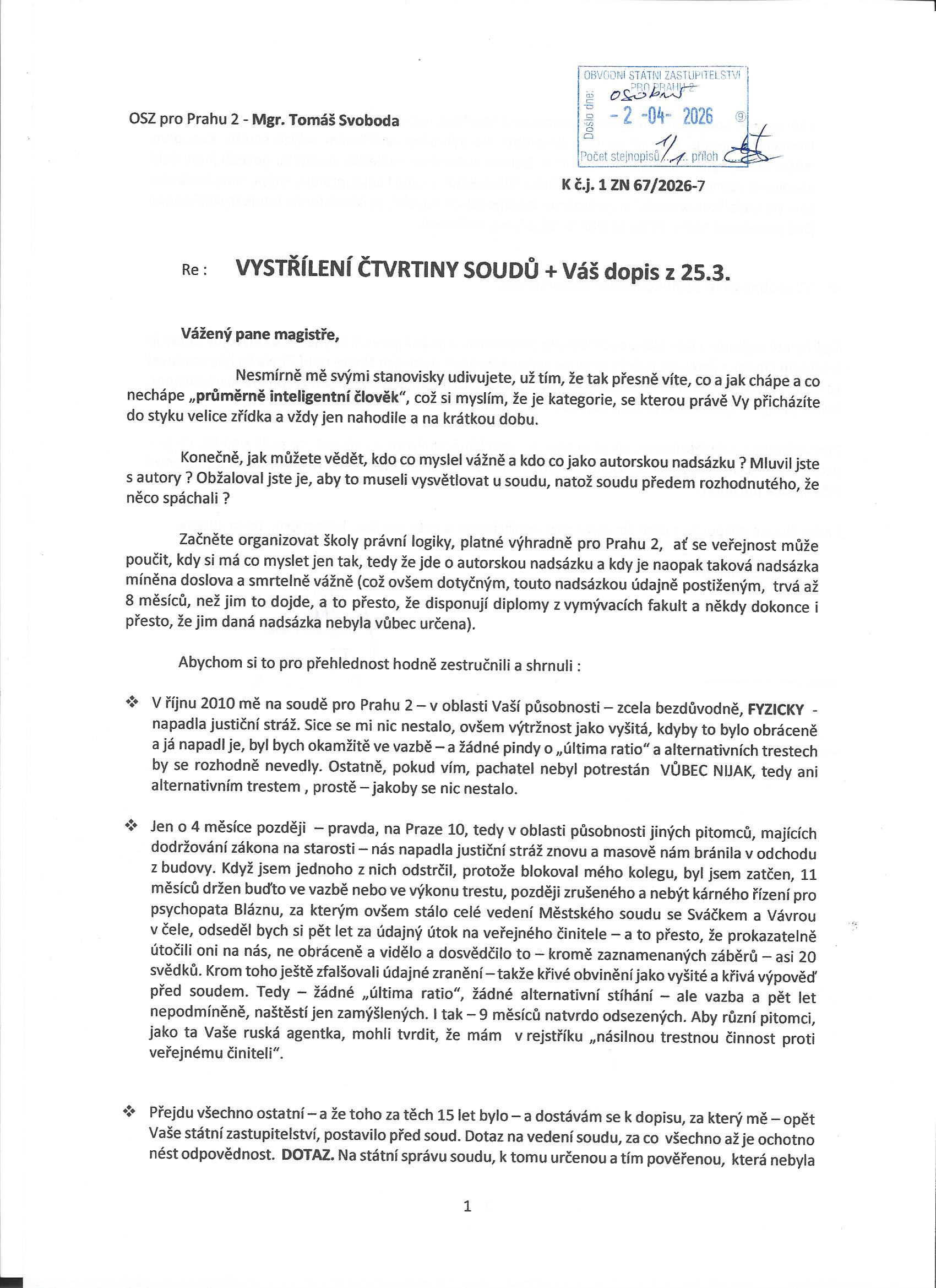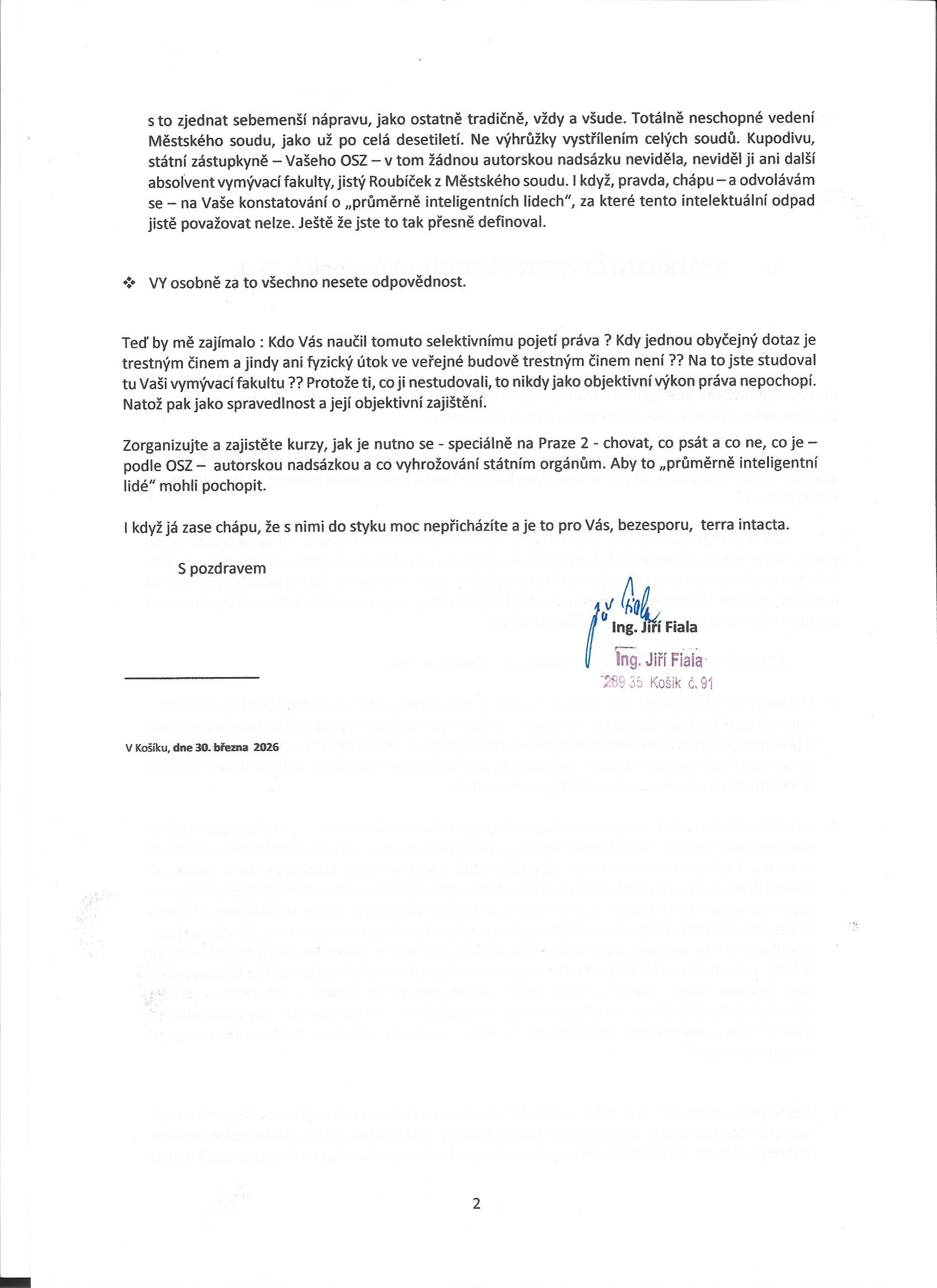 v Přejdu všechno ostatní – a že toho za těch 15 let bylo – a dostávám se k dopisu, za který mě – opět Vaše státní zastupitelství, postavilo před soud. Dotaz na vedení soudu, za co všechno až je ochotno nést odpovědnost. DOTAZ. Na státní správu soudu, k tomu určenou a tím pověřenou, která nebyla s to zjednat sebemenší nápravu, jako ostatně tradičně, vždy a všude. Totálně neschopné vedení Městského soudu, jako už po celá desetiletí. Ne výhrůžky vystřílením celých soudů. Kupodivu, státní zástupkyně – Vašeho OSZ – v tom žádnou autorskou nadsázku neviděla, neviděl ji ani další absolvent vymývací fakulty, jistý Roubíček z Městského soudu. I když, pravda, chápu – a odvolávám se – na Vaše konstatování o „průměrně inteligentních lidech“, za které tento intelektuální odpad jistě považovat nelze. Ještě že jste to tak přesně definoval.