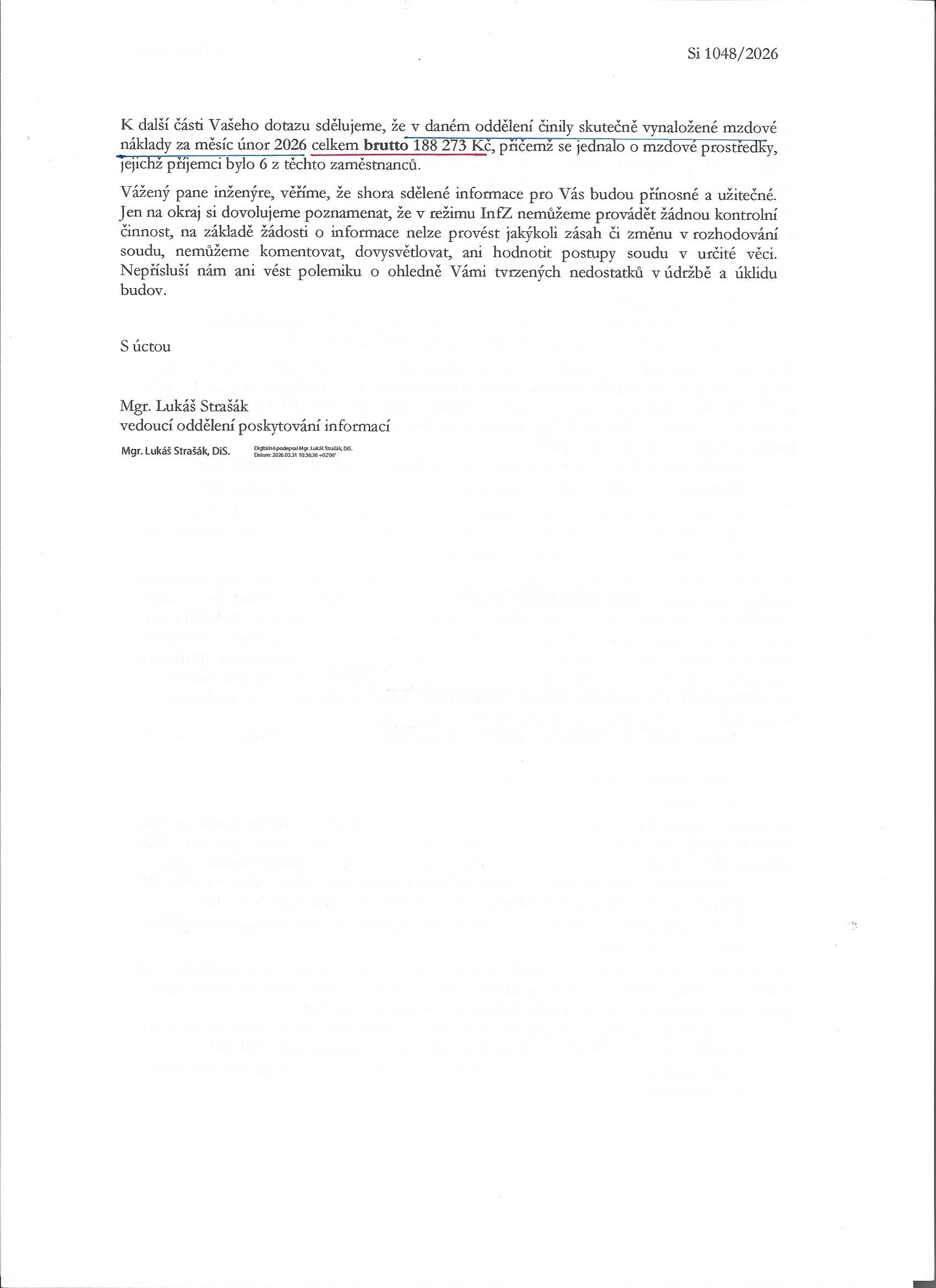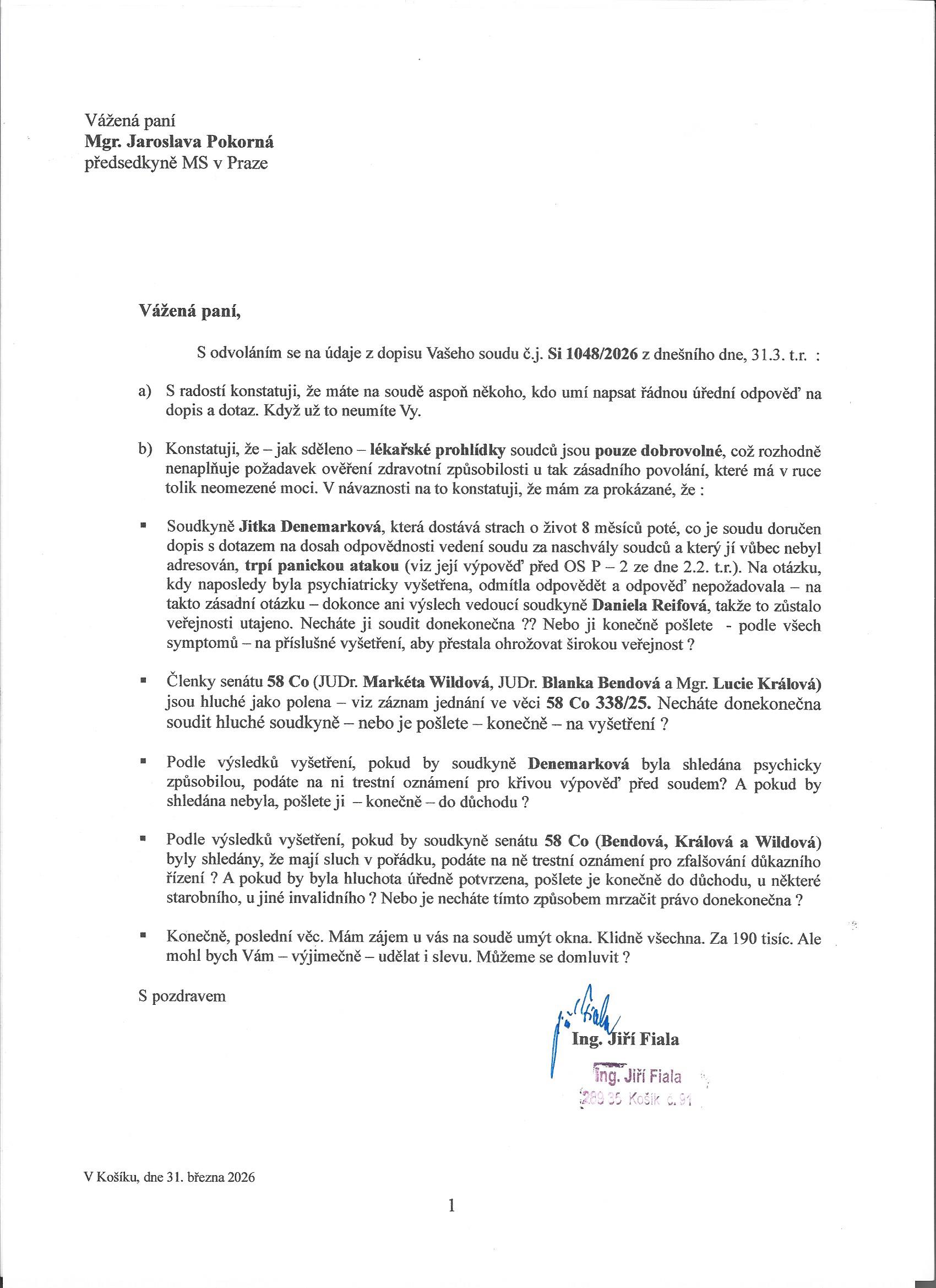 S odvoláním se na údaje z dopisu Vašeho soudu č.j. Si 1048/2026 z dnešního dne, 31.3. t.r. :