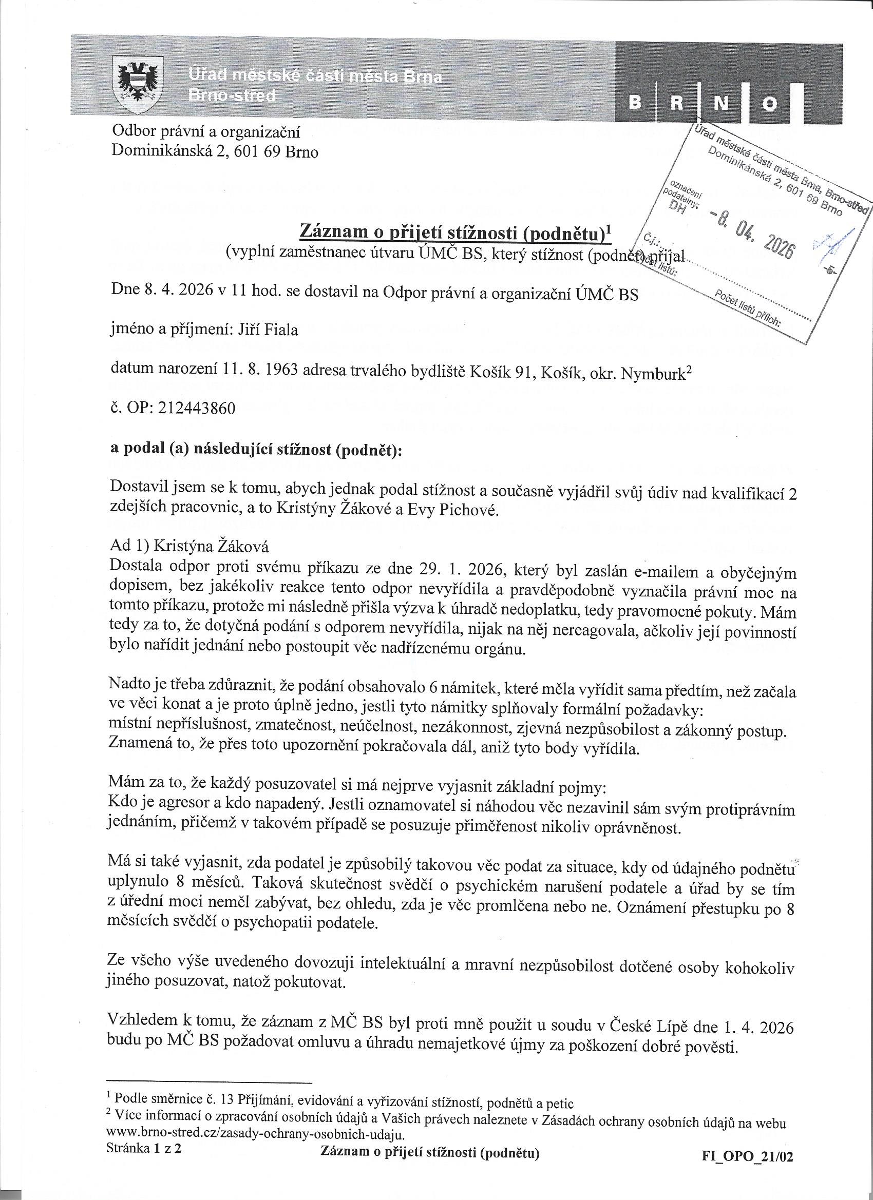 Tak za tenhle dopis, v té době 8 měsíců starý, mi přišla z Brna pokuta. Dopálilo mě to, hlavně proto, jaká hloupoučká husa to zase psala a vystavila. Kdy zcela pominula, kdo je vlastně napadeným a kdo obětí. A kdo byl napadeným, když já jsem předtím nějakýho Ciběnu vůbec neznal a nijak mě nezajímal ?