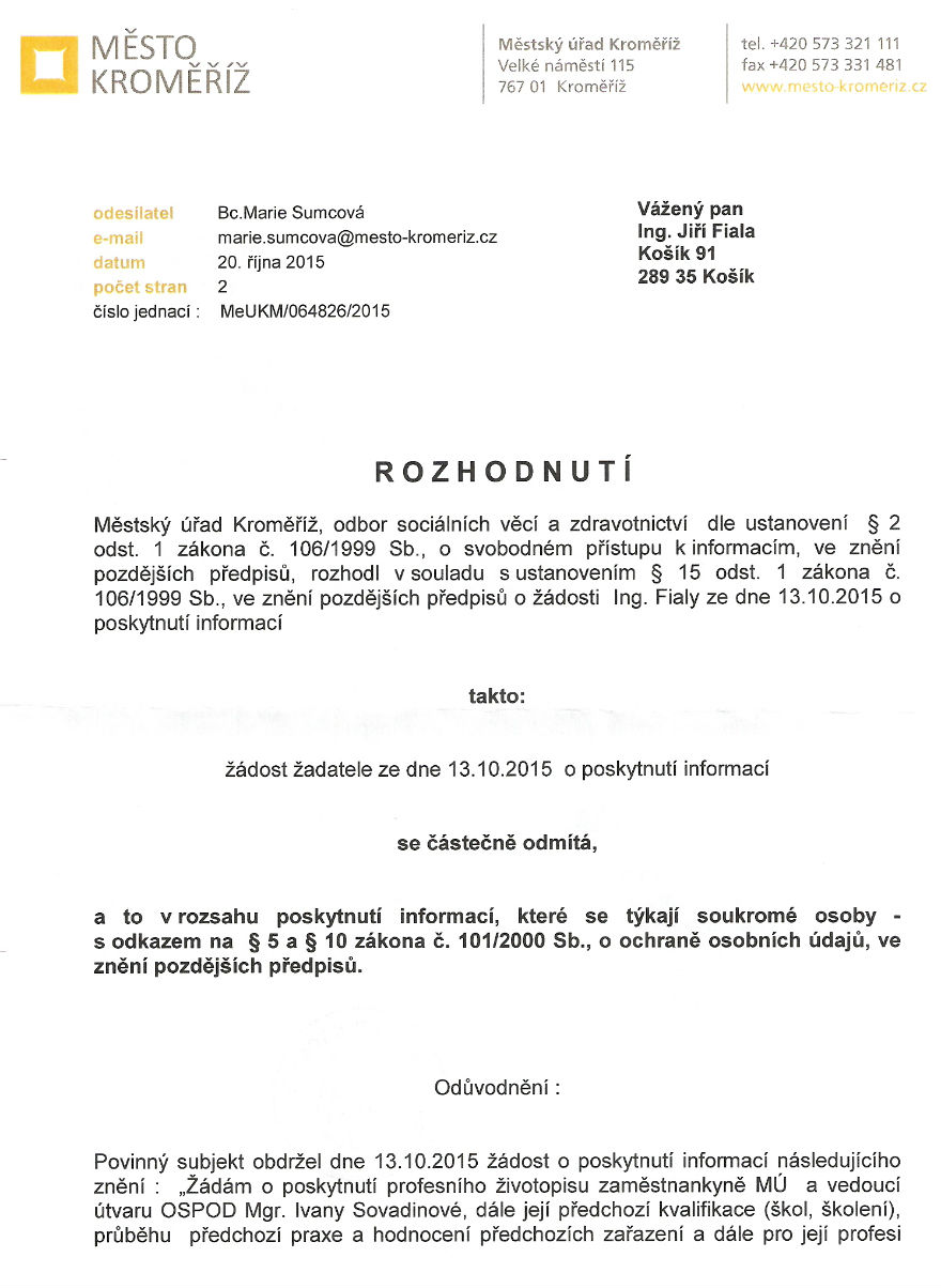 Přebíráme jak dopis MÚ v Kroměříži s "Rozhodnutím" o poskytnutí, resp. neposkytnutí informace, tak i reakci na něj, která byla již MÚ v Kroměříži zaslána.