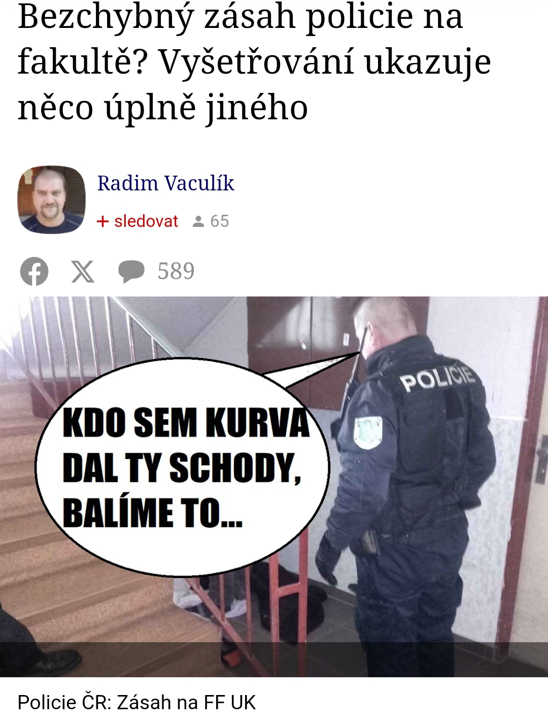 Nejlepší policie na světě - Aktuálně je v médiích, že Karlova univerzita podala stížnost proti odložení věci - nesprávný a nevčasný zásah policie před střelbou na fakultě. Je zajímavé to sledovat, že i státní složky, kam řadím univerzitu, jsou zděšeni, jak ve skutečnosti vypadá standardní postup policie - šlendriánství a nezákonnosti, ale podle inspekce a vyšetřování je vše v naprostém pořádku. V ČR je nejlepší policie na světě - do momentu, než s ní má člověk zkušenosti. KP