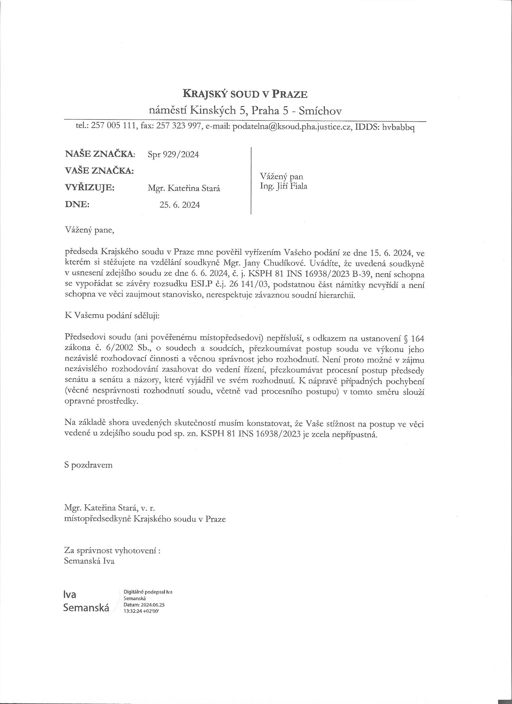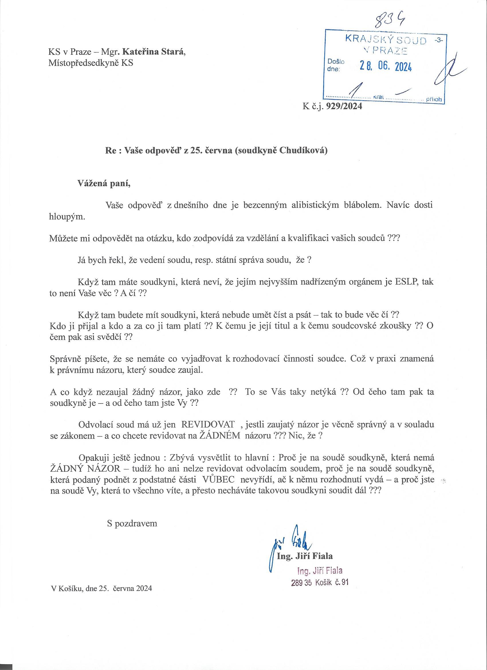 Současné vedení KS v Praze usoudilo, že nejlepší bude rozesílat - coby odpovědi - de facto namnožené formuláře - o tom, že i přes poučení, stejně chcete, aby se vyjadřovali k rozhodovací činnosti soudce, což oni zásadně nesmí. Až tak jsou "čestní a nezávislí..."