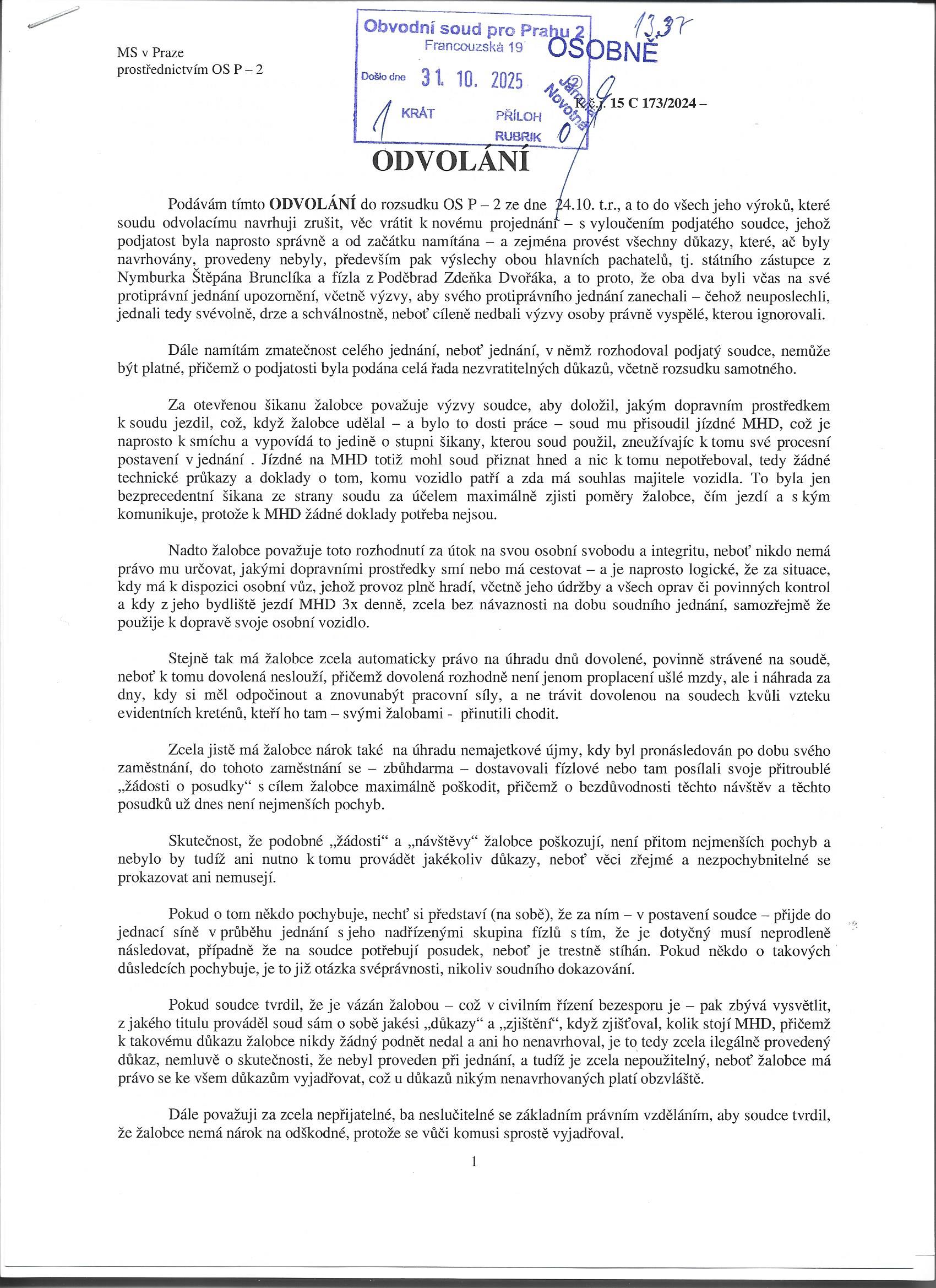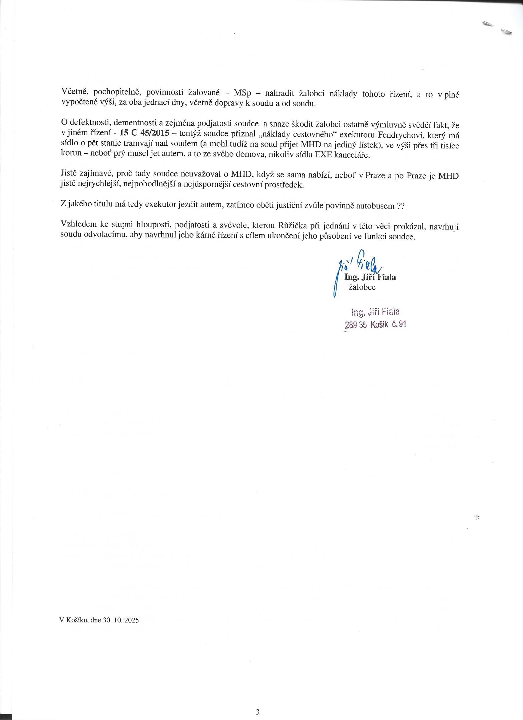 - Sprostota tohoto rozhodnutí obzvláště vynikne při vědomí - a při srovnání - že tentýž soudce přiznal exekutoru Fendrychovi, který přijel na soud svědčit v jiné kauze a který má kancelář o pět stanic tramvají nad soudem - a tedy mu stačí jediný lístek na MHD - cestovné ve výši 3.500,- Kč - kteroužto pohledávku přihlásil - jako jedinou možnou - soud pro Prahu 2 do mého insolvenčního řízení - a která bude sražena z výnosu insolvence