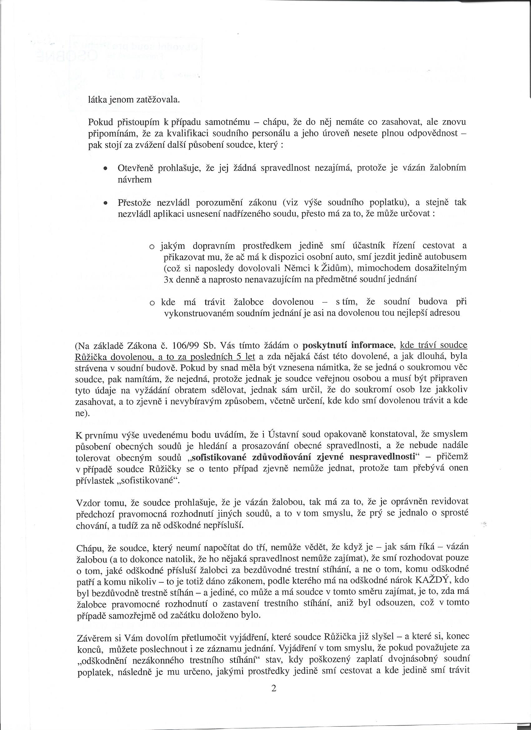 Dopis předsedkyni soudu na Praze 2 :