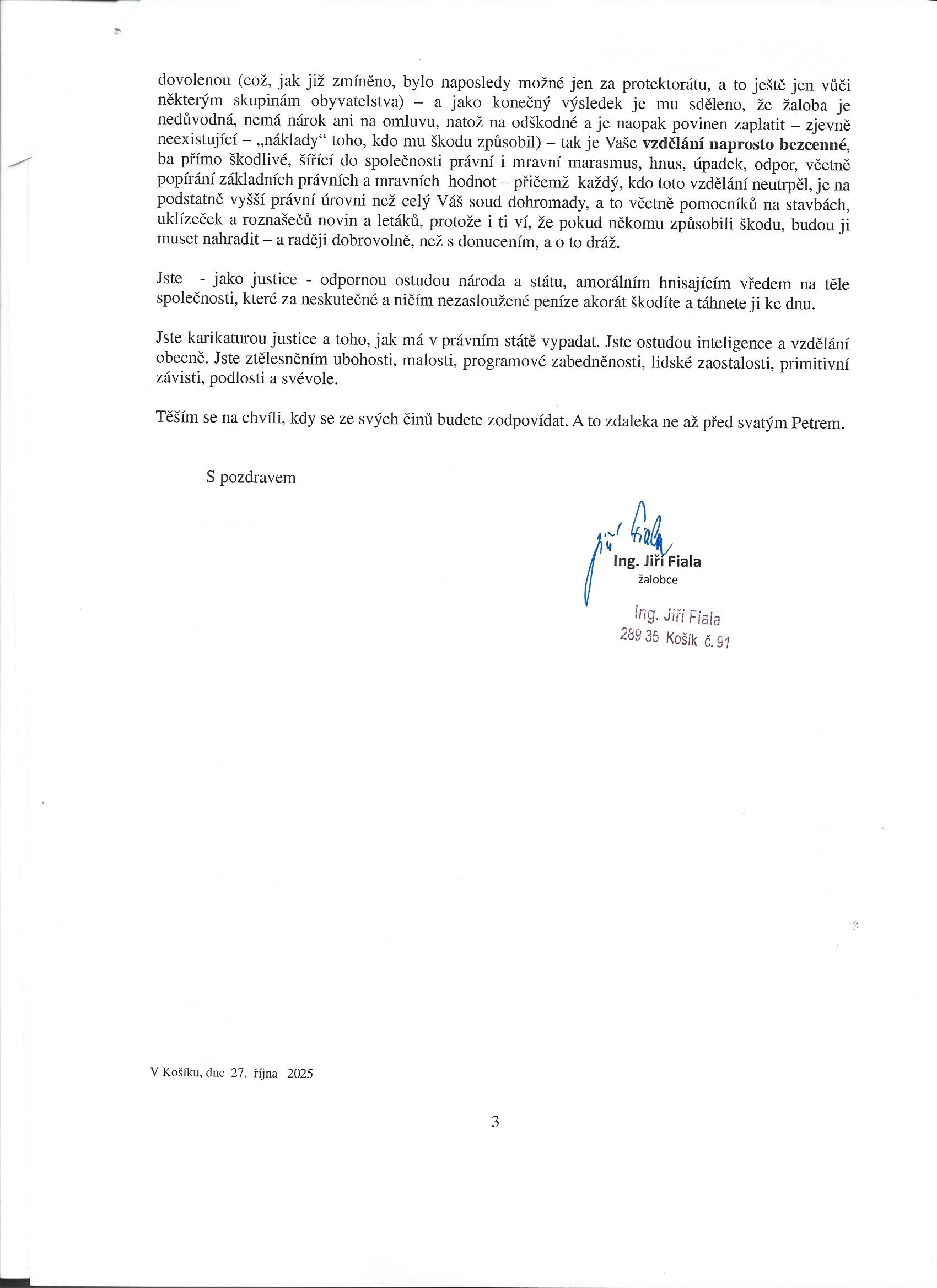 Závěrem si Vám dovolím přetlumočit vyjádření, které soudce Růžička již slyšel – a které si, konec konců, můžete poslechnout i ze záznamu jednání. Vyjádření v tom smyslu, že pokud považujete za „odškodnění nezákonného trestního stíhání“ stav, kdy poškozený zaplatí dvojnásobný soudní poplatek, následně je mu určeno, jakými prostředky jedině smí cestovat a kde jedině smí trávit dovolenou (což, jak již zmíněno, bylo naposledy možné jen za protektorátu, a to ještě jen vůči některým skupinám obyvatelstva) – a jako konečný výsledek je mu sděleno, že žaloba je nedůvodná, nemá nárok ani na omluvu, natož na odškodné a je naopak povinen zaplatit – zjevně neexistující – „náklady“ toho, kdo mu škodu způsobil) – tak je Vaše vzdělání naprosto bezcenné, ba přímo škodlivé, šířící do společnosti právní i mravní marasmus, hnus, úpadek, odpor, včetně popírání základních právních a mravních hodnot – přičemž každý, kdo toto vzdělání neutrpěl, je na podstatně vyšší právní úrovni než celý Váš soud dohromady, a to včetně pomocníků na stavbách, uklízeček a roznašečů novin a letáků, protože i ti ví, že pokud někomu způsobili škodu, budou ji muset nahradit – a raději dobrovolně, než s donucením, a o to dráž.