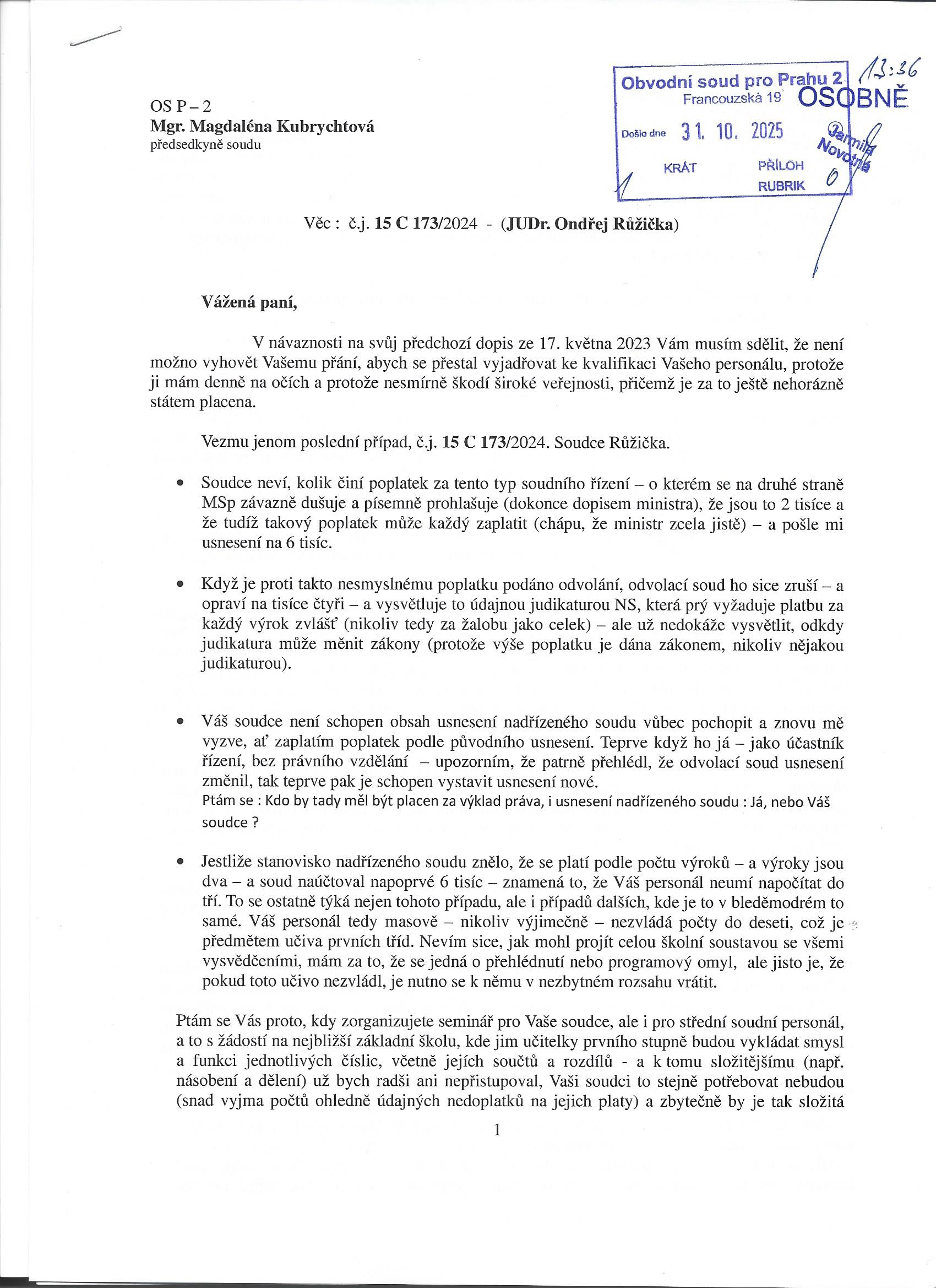 Vezmu jenom poslední případ, č.j. 15 C 173/2024. Soudce Růžička.