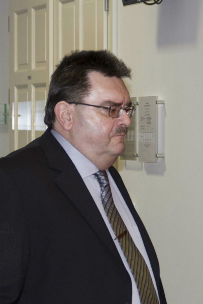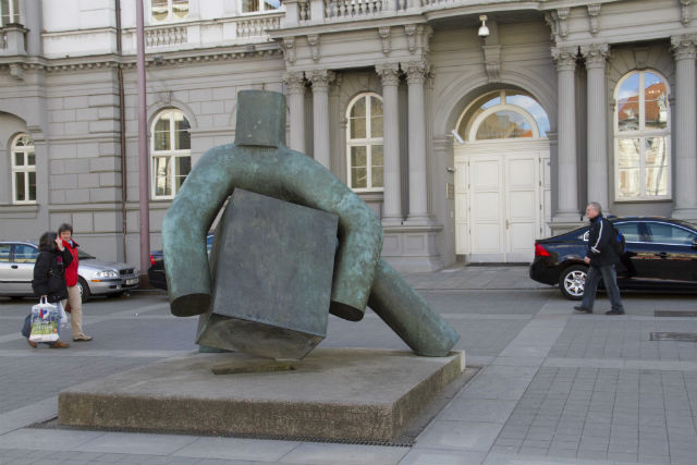 Exekutor JUDr. Tomáš Vrána na NSS v Brně, a to před kárným senátem dne 3. března 2015 Sousoší "Exekutor krade pračku" stojí před NSS v Brně správně ...