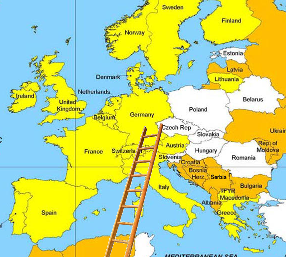 Vzpomínám si na plakáty, těsně po Velkém vítězném listopadu hojně vyvěšované - byla na nich západní Evropa - a vysoký žebřík, po kterém do ní máme vyšplhat. Stálo pod tím : Zpátky do Evropy !!