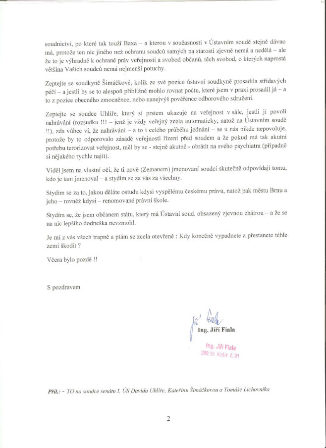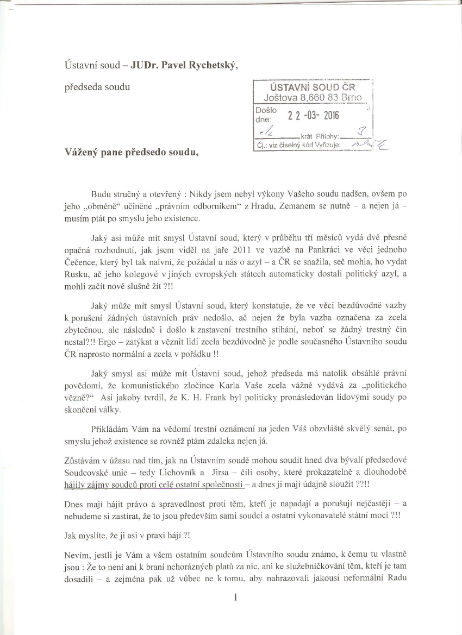 Stěžovatel upřesňuje, že smrtí nikomu nevyhrožoval, to si účelově vyprefabrikovaly soudy, aby ho vůbec měly za co odsoudit (on pouze napsal dávno vyloučenému soudci Malému, jenž zavinil prohru státu ve Štrasburku ve věci stejného stěžovatele, a v souvislosti s tím, že ztopil odvolání a vůbec ho nepředložil odvolacímu soudu, že „nepřežije další setkání s ním“ – což vůbec neznamenalo, že ho stěžovatel hodlá zabít, ale – jak také vysvětlil – skutečnost, že soudce Malý trpěl ze stěžovatele takovou fóbií, kterou sám popisoval, že bylo lze reálně očekávat, že skutečně příští setkání nemusí přežít, a to v důsledku zdravotní indispozice, např. infarktu – což rozhodně není vyhrožování smrtí stěžovatelem).