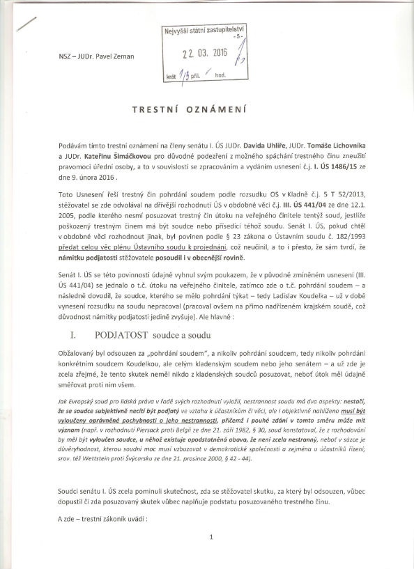 Podávám tímto trestní oznámení na členy senátu I. ÚS JUDr. Davida Uhlíře, JUDr. Tomáše Lichovníka a JUDr. Kateřinu Šimáčkovou pro důvodné podezření z možného spáchání trestného činu zneužití pravomoci úřední osoby, a to v souvislosti se zpracováním a vydáním usnesení č.j. I. ÚS 1486/15 ze dne 9. února 2016 .