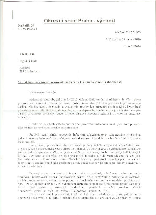 Jediné, co je ve Vašem dopise pravda, je to, že jsem tam nechtěl čekat – jednak jsem spěchal – jednak, když jsem viděl tu neskutečnou dezorganizaci, tak jsem nabyl dojmu, že tady skutečně není čekat na co. Resp. že bych se k tomu zápisu nemusel dopracovat ani do konce pracovní doby, a tolik času jsem rozhodně neměl – nemluvě o tom, že nehodlám – zadarmo – dělat práci za Vás a organizovat celý soud, který je v rozkladu.