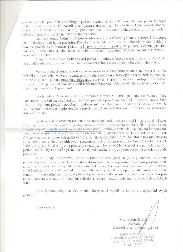 Předně bych rád opravil, resp. uvedl na správnou míru, tvrzení, že jsem nechtěl s nikým jiným než s Vámi mluvit. To je okatá lež, nevím, jestli Vaše nebo Vašich podřízených, ale rozhodně lež jako věž. Naopak – po justiční stráži jsem chtěl, ať seženou KOHOKOLIV, kdo je schopen sepsat úřední záznam a trval jsem na tom i tehdy, když mi tvrdili, že tam jistá paní – nevím jaká – není, protože nechápu, jak může soud v úřední den v pracovní době nemít NIKOHO, kdo by sepsal úřední záznam, když je plný úředníků na všech odděleních soudu a každý z nich to nejen může, ale taky má udělat.