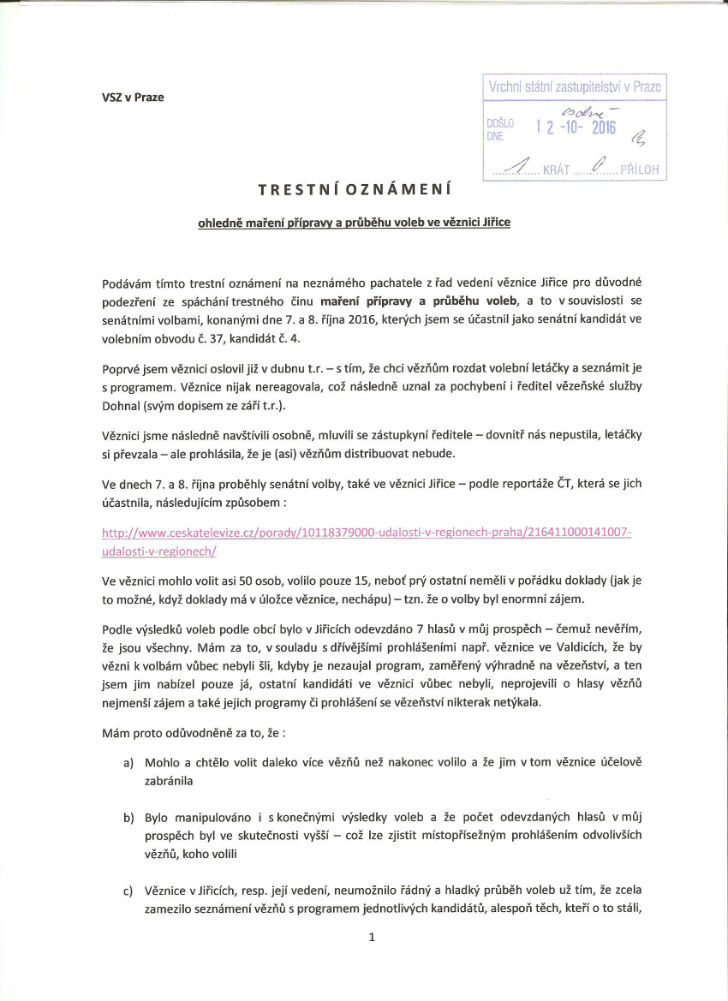 Podávám tímto trestní oznámení na neznámého pachatele z řad vedení věznice Jiřice pro důvodné podezření ze spáchání trestného činu maření přípravy a průběhu voleb, a to v souvislosti se senátními volbami, konanými dne 7. a 8. října 2016, kterých jsem se účastnil jako senátní kandidát ve volebním obvodu č. 37, kandidát č. 4.