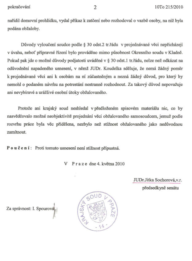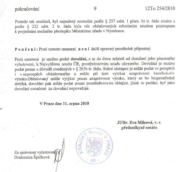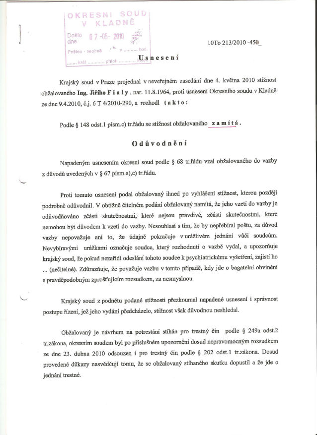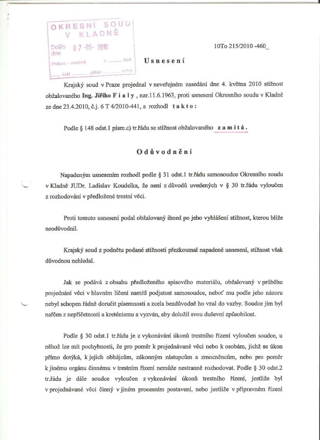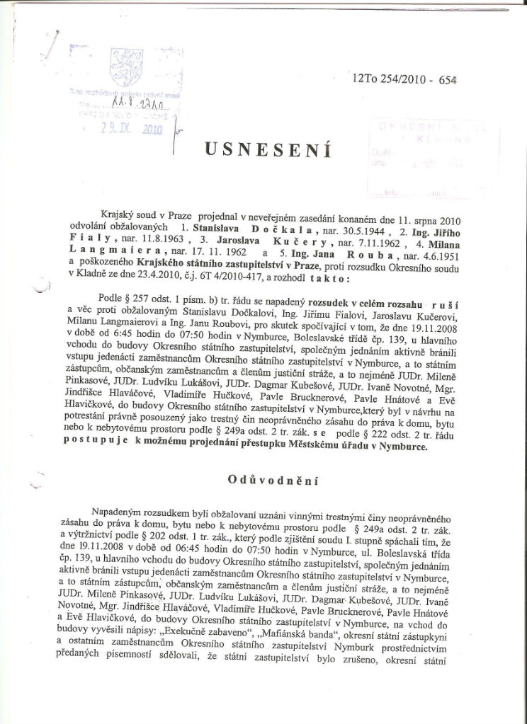 - Usnesení č.j. 12 To 254/2010-654 ze 11.8. 2010 (o zrušení rozsudku OS v Kladně č.j. 6 T 4/2010 ze dne 23.4. 2010)