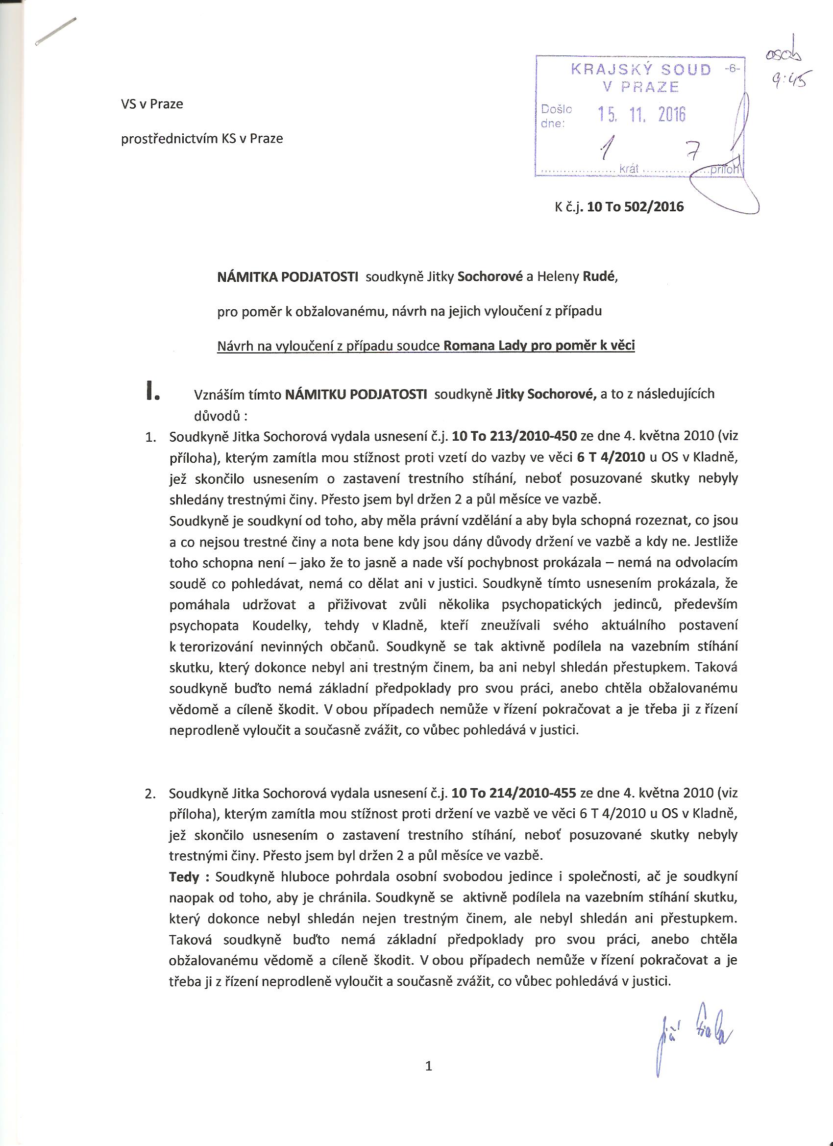 Na základě všech výše uvedených skutečností proto obžalovaný navrhuje, aby byla soudkyně Jitka Sochorová z případu vyloučena pro dlouhodobou snahu škodit obžalovanému a terorizovat jeho osobu jakožto osobu uznávaného představitele občanské společnosti a pro nezpůsobilost vykonávat funkci soudce.