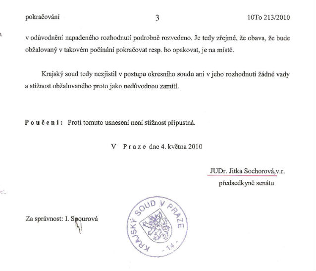 3. Soudkyně Jitka Sochorová vydala usnesení č.j. 10 To 215/2010-460 ze dne 4. května 2010 (viz příloha), kterým potvrdila další rozhodování ve věci 6 T 4/2010 u OS v Kladně psychopata Koudelky, jenž mne bezdůvodně vzal do vazby a v té dva a půl měsíce držel. Dále mne tento psychopat odsoudil k půlročnímu nepodmíněnému trestu ve věci, která nebyla shledána ani trestným činem, ale ani přestupkem.