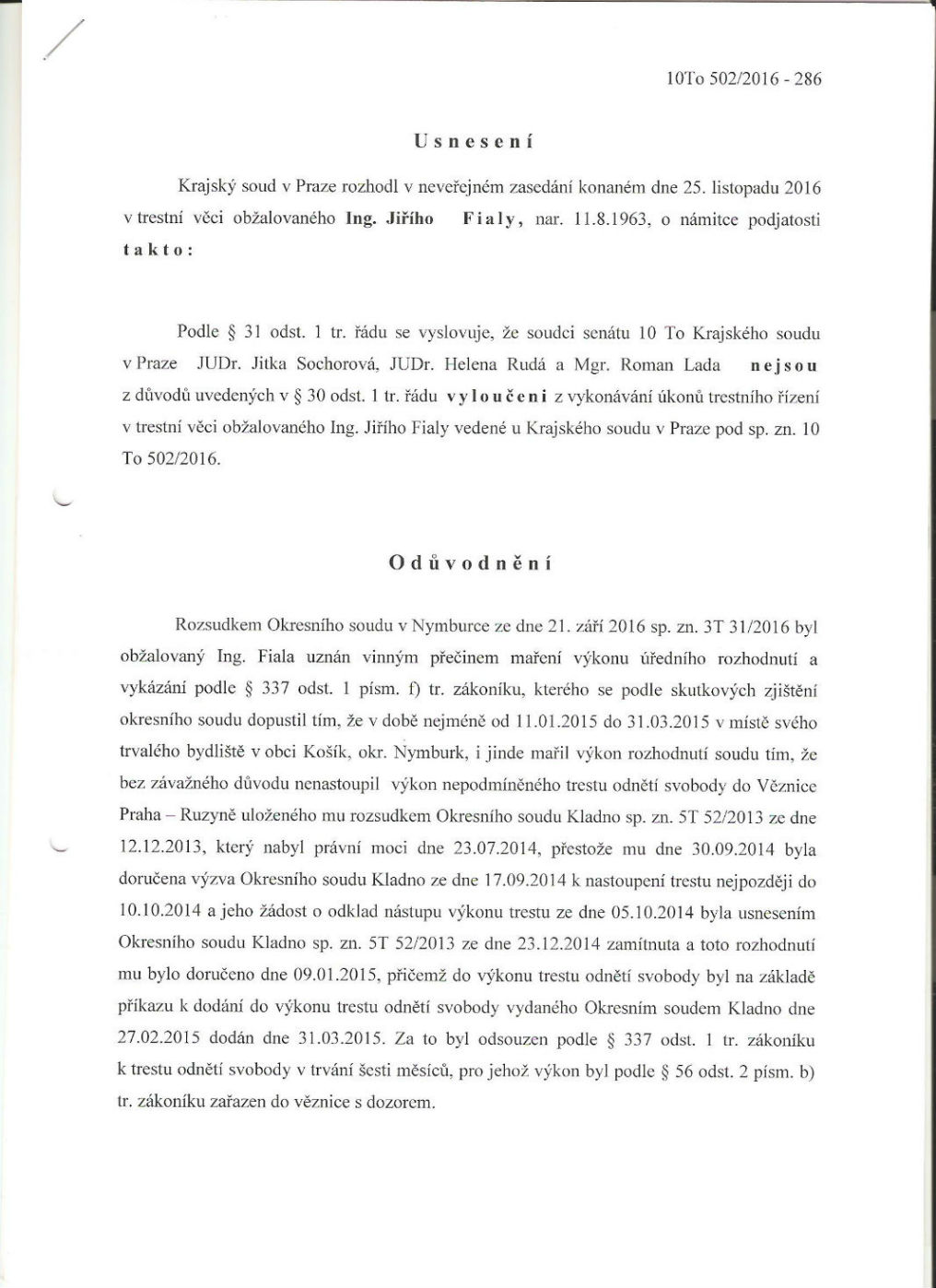 Stejnou námitku lze vznést i vůči soudcům VS Bohumilu Kalátovi či Františku Romanovi, kteří udržovali u věci bývalou soudkyni Maříkovou ze senátu 9 To KS v Praze, ač museli dobře vědět, že si věc obžalovaného záměrně vybrala zcela mimo pořadí příchozích věcí, a to jen proto, aby mohla obžalovanému cíleně škodit, což také následně dělala. Výjimečnost rozsudku za pohrdání soudem (5 měsíců nepodmíněně) ostatně jednoznačně konstatoval i Ústavní soud ve svém usnesení č.j. I. ÚS 1486/15 s tím, že se jedná o trest zcela výjimečný a ojedinělý.