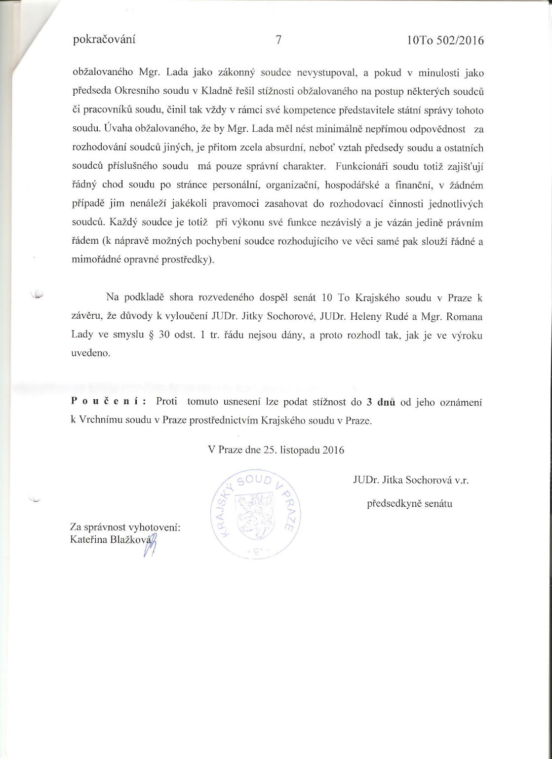 Jak již uvedeno v záhlaví, navrhuji proto soudu vyššího stupně, aby všechny tři zmíněné výtečníky z dalšího řízení vyloučil, u Sochorové pak jsou jednoznačně dány důvody k zahájení kárného řízení s cílem zbavení funkce soudce, protože sama píše, že dobře ví, že v dosavadním řízení bylo všechno špatně, přesto v něm chtěla a chce pokračovat – a jde tak daleko, že nařízením odvolacího jednání legalizuje zjevně neplatné hlavní líčení a zejména na něm v nepřítomnosti obžalovaného vydaný rozsudek, ač musí dobře vědět, že trpí takovými procesními vadami, že jej nelze za platný prvostupňový rozsudek považovat, a tudíž nelze odvolací jednání vůbec nařídit.