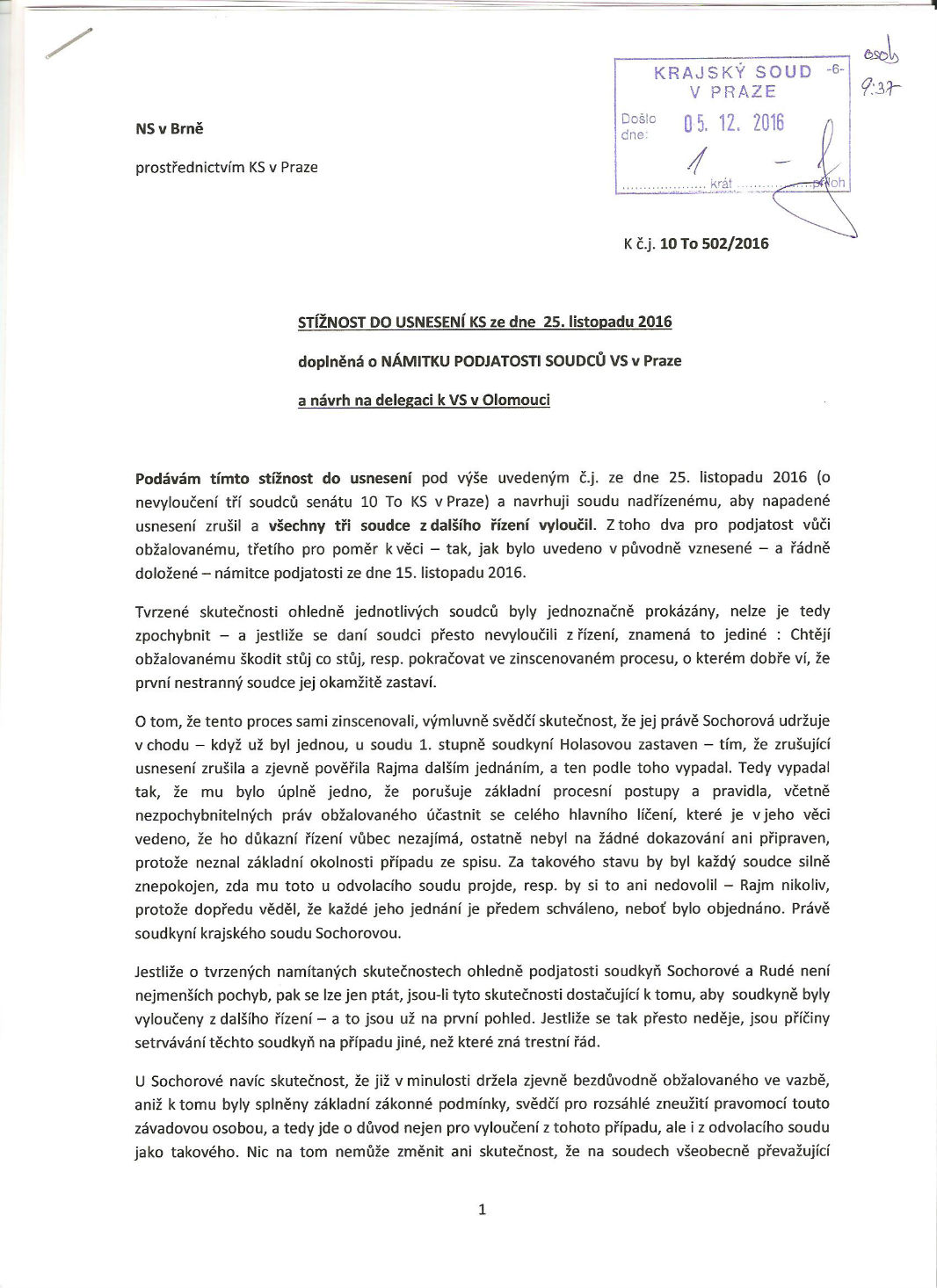 Obžalovaný je pevně přesvědčen o tom, že za stavu, kdy je v trestním řízení prakticky od začátku všechno špatně (obviněnému nebylo nikdy řádně sděleno obvinění – což OČTŘ včas věděly a byly na to – samotným obviněným – mnohačetně a včas upozorňovány, následně proběhlo neplatné hlavní líčení, které – i podle samotné Sochorové – ani nemělo proběhnout, vzhledem k zásadním a nezhojitelným vadám přípravného řízení), důkazy se zásadně neprovádí nebo se s nimi ani fízl, ani soudce není schopen nijak vypořádat – a je jim to zjevně jedno, tedy dávají jasně najevo, že celé trestní řízení je zjevně účelové, předem objednané a také s předem daným výsledkem, coby pomstou za senátorskou kampaň vedenou obžalovaným za zásadní reformu justice, přičemž výsledek řízení je zcela nezávislý na důkazním řízení, důvodné podjatosti soudců i ostatních šašků z OČTŘ – tedy za takovéto situace může v řízení pokračovat jedině zločinec spoléhající na to, že – zatím – není postižitelný, nebo si to alespoň myslí, a to vzdor mnohačetným důkazům o porušení prakticky všech základních pravidel a předpisů trestního řízení od samého počátku až do současnosti.