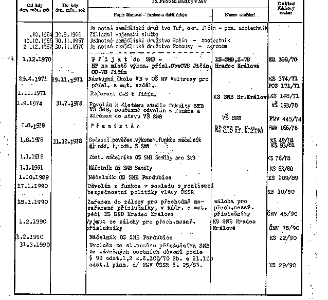 1.12.1970 | Přijat do SNB - HP na místě výkon. přísl. ObvOVB Jičín, OO-VB Jičín | KS-SNB,S-VB Hradec Králové | KR 188/70 | |