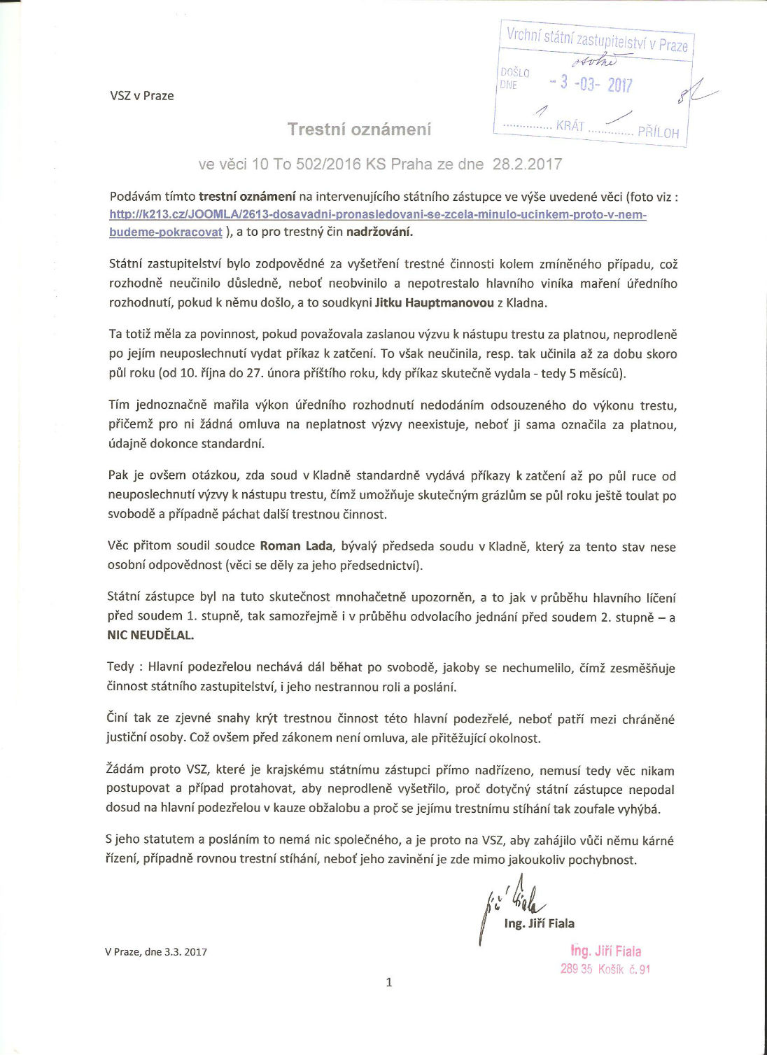 Navrhuji proto nadřízenému VSZ, aby na intervenujícího státního zástupce podalo kárnou žalobu s návrhem na ukončení funkce na KSZ, neboť na ni státní zástupce nestačí.