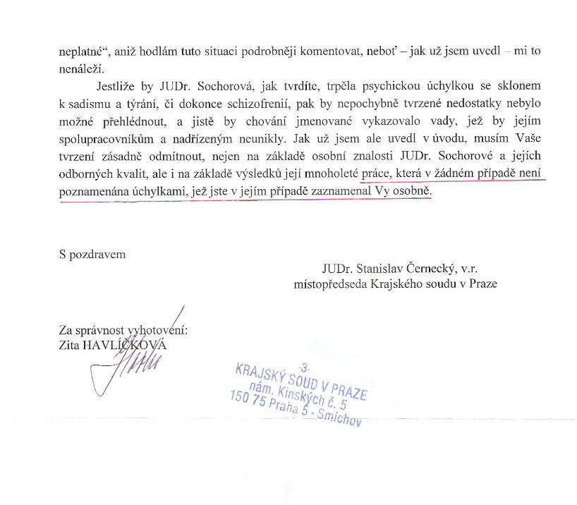 O tom, že by si její psychopatie jistě všimli její nadřízení, o tom se dá uvažovat jedině s úsměvem. Vy byste si nejspíš nevšimnul ani krávy uvázané za řetěz ke vchodu soudu, natož nějaké Sochorové.