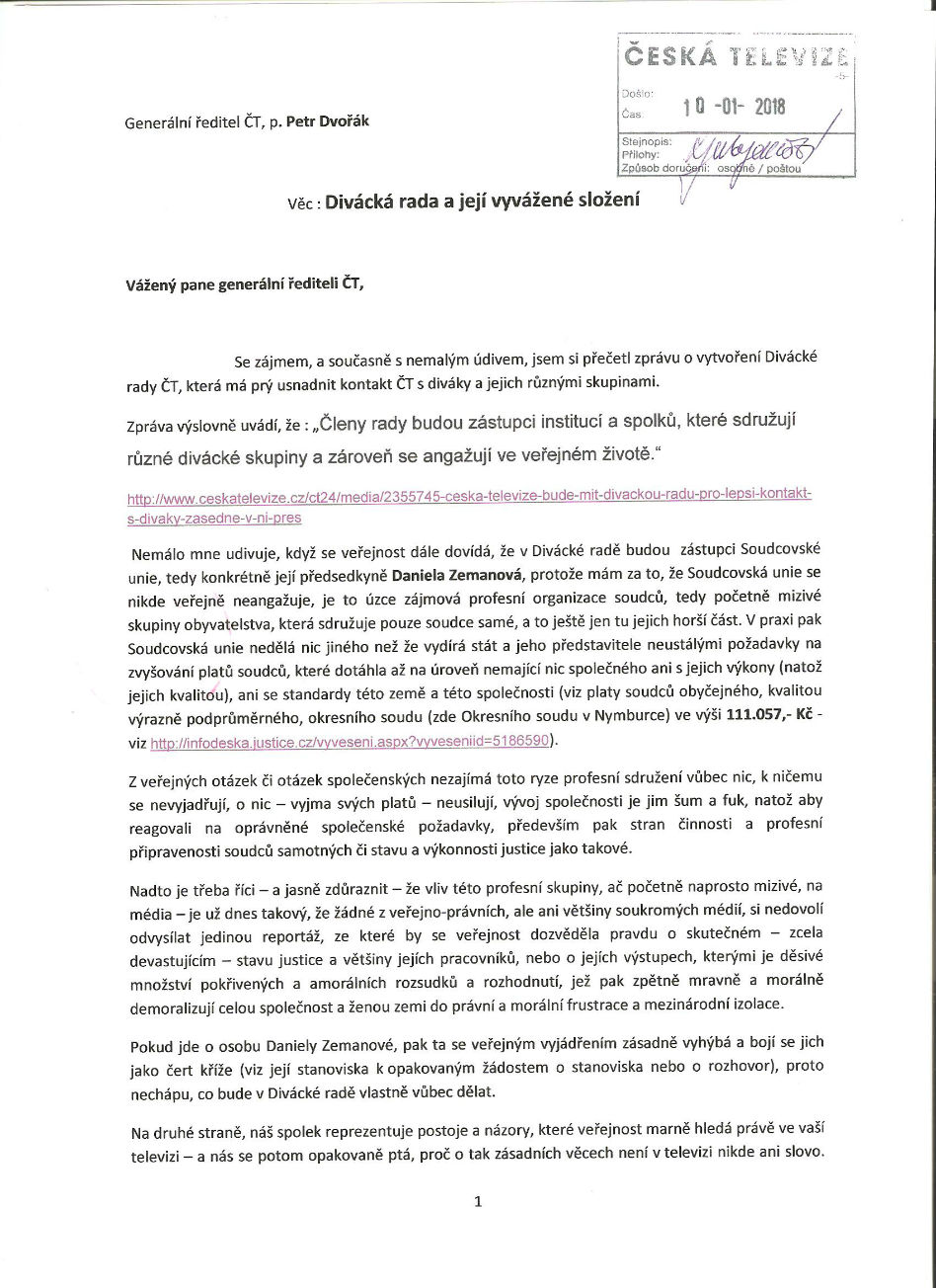Jestliže zájmy a názory – řekněme – divácké skupiny, představované nejen členy, ale i širší veřejností, jež pravidelně sleduje naše stránky, nebyly dosud nikde – krom těchto stránek samých – komunikovány a nikde nezaznívaly – a hlad po těchto informacích zjevně je nemalý – žádám Vás tímto, abyste do Divácké rady neprodleně přizval zástupce našeho spolku, tedy sdružení K 213, a to zvláště pak za situace, kdy má v Divácké radě zůstávat Daniela Zemanová, coby představitelka profesní skupiny soudců, resp. té jejich horší – byť nemalé - části.
