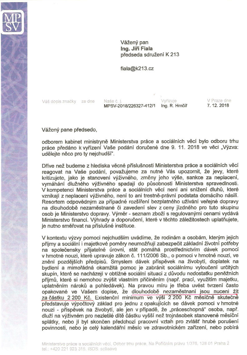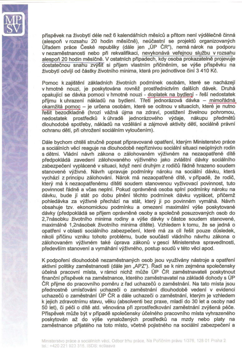 Až po měsíci přišla - poměrně obsáhlá - odpověď z MPSV, jejíž obsah sice rekapituluje jednotlivé dávky, samozřejmě připouští, že ti nejchudší jsou nuceni žít za 2.200,- Kč - a že to nejsou samoživitelky - dál by se ale celé obsáhlé sdělení dalo shrnout do jediné věty : NEUDĚLÁME NIC .