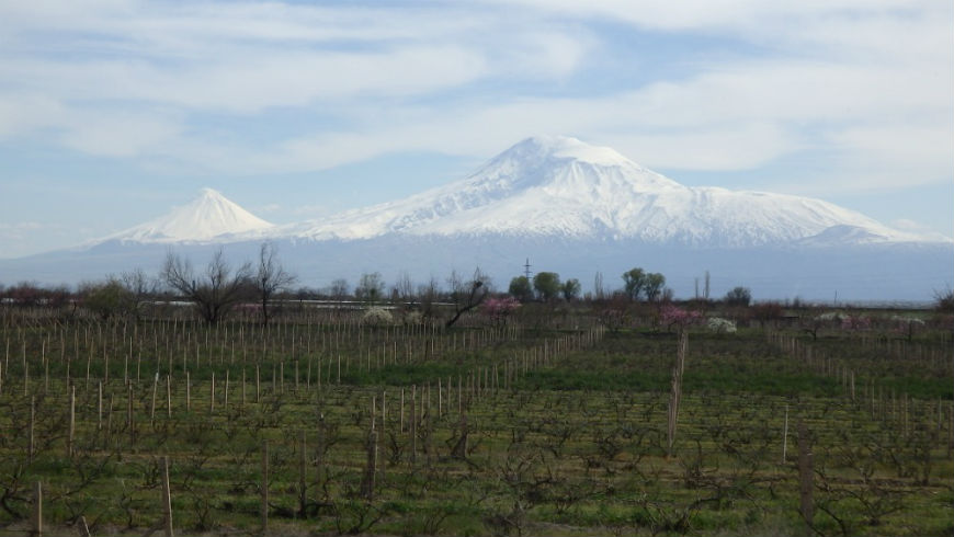 Naše vlastní foto Malého a Velkého Araratu z Edžmiatsinu. Ale - stejně jako předtím, platí : Před nimi vinice, mezi nimi hranice...