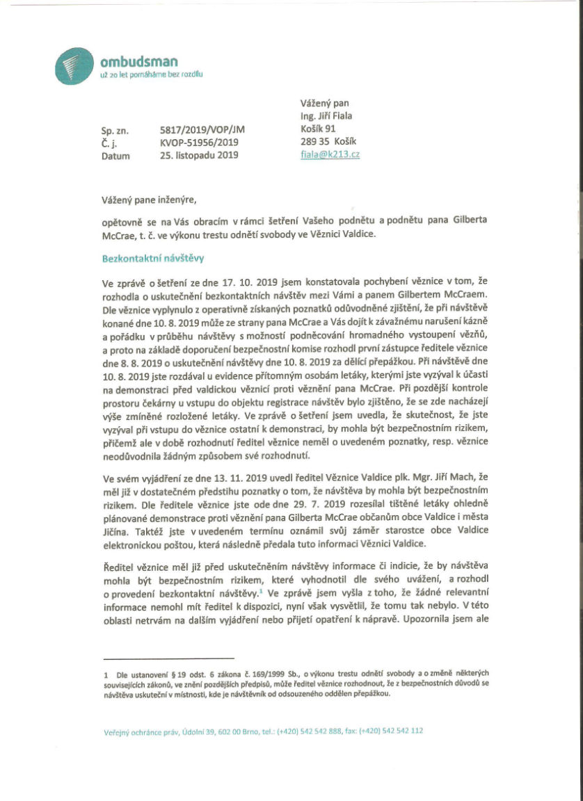 Chci se vyjádřit k Vašemu dopisu ze dne 25.11. 2019 ve věci p. Gilberta McCraee a stížností s ním spojených, tedy bezdůvodné návštěvy za sklem a odmítnutí osoby blízké.