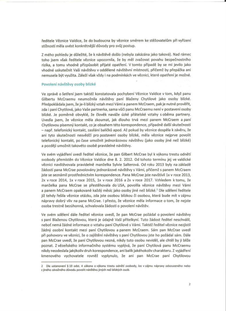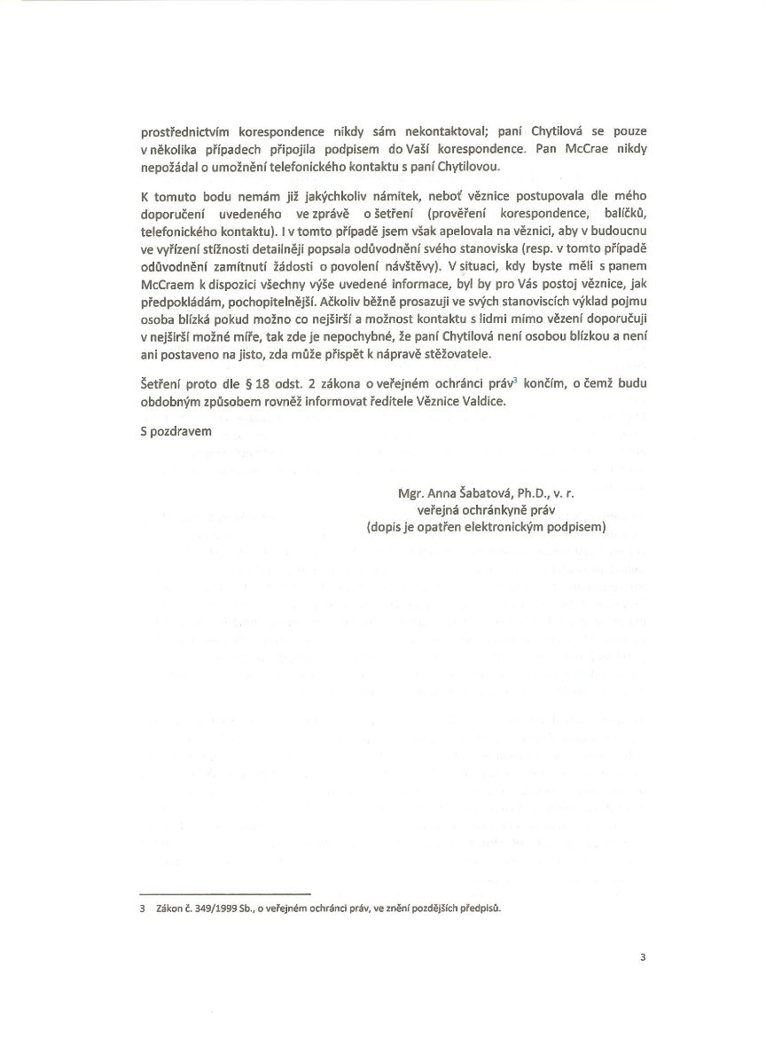 Dopis ombudsmance Anně Šabatové k jejímu stanovisku ve věci Gilberta McCraee :