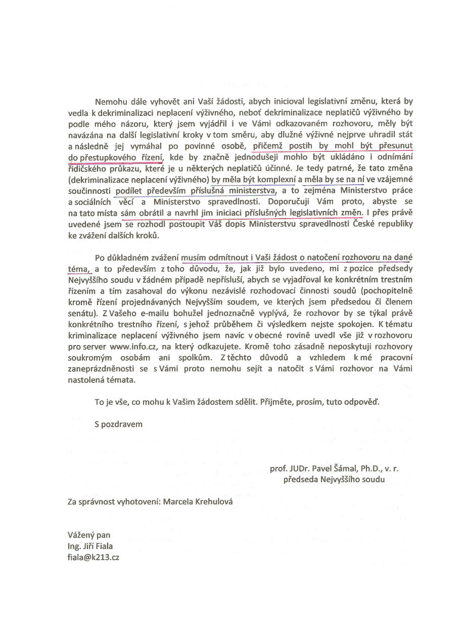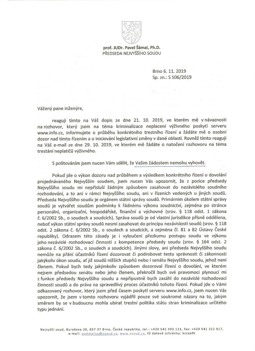 k Vaší dnešní telefonické žádosti Vám v příloze opětovně zasílám odpověď předsedy Nejvyššího soudu, prof. JUDr. Pavla Šámala, Ph.D., k Vaší žádosti ze dne 21. 10. 2019.
