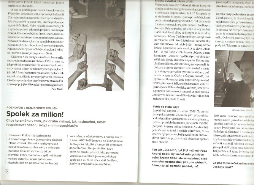 Rozhovor s Benjaminem Rollem jsme dělali primárně kvůli tomu, abychom ukázali, jak se mladý člověk vyrovnává s autoritou, mocí, strachem, vizemi a závazky, které vyplývají z jeho jednání. Samozřejmě bylo zajímavé vyzpovídat člověka, který se ocitl na společenském výsluní (to se nepovede každému, kdo zorganizuje pár demonstrací) a navíc je to student bohosloví.
