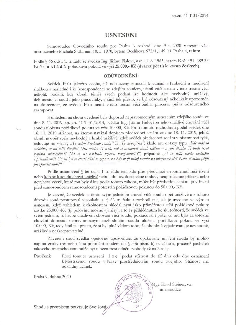 Poslal mi usnesení v č.j. 41 T 31/2014, (ze dne 9. dubna t.r.), kde navíc ani nevystupuji jako účastník řízení, a dal mi za to 25 tisíc pokuty.