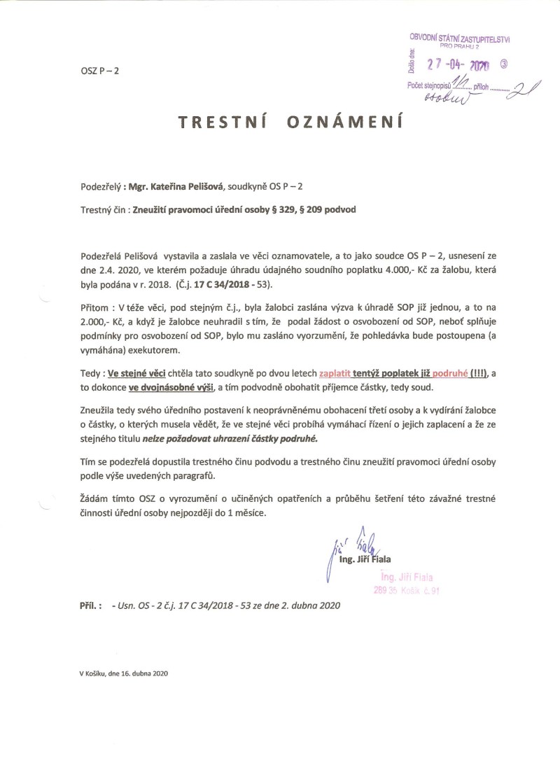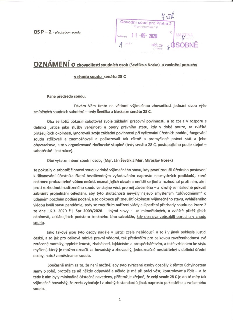 Oznámení o ZHOVADILOSTI soudních osob, podané dnes předsedovi soudu pro Prahu 2 :