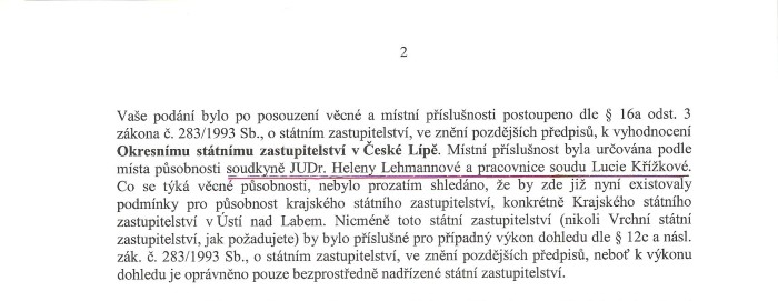 Následně mi přišla odpověď od předsedkyně z České Lípy – právě o tom, že stížnost prý nepovažovala za to, že by ji měla řešit ona (ona, předsedkyně soudu, nepovažovala stížnost na její soud za něco, co by měla řešit !!) .
