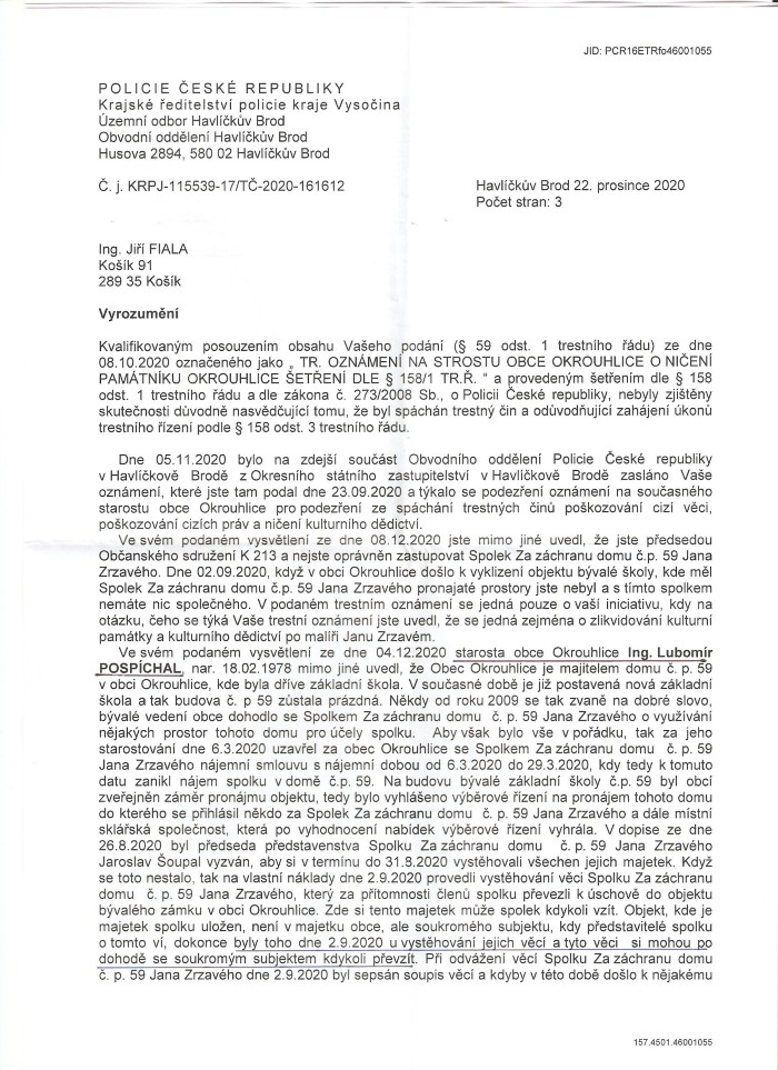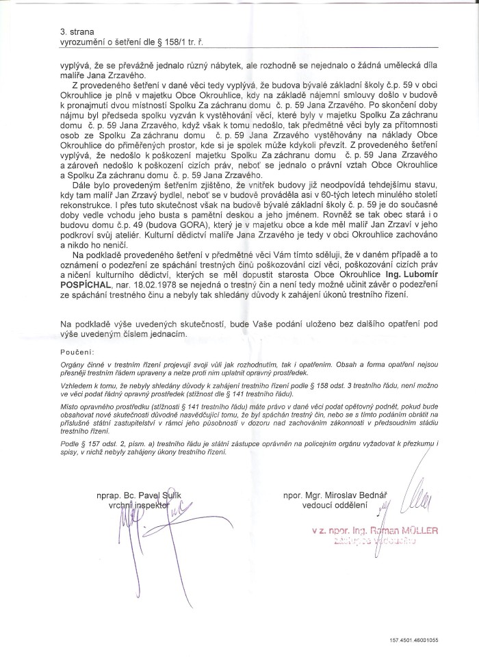 A dále také to, že zničení jeho rodiště - tedy původního vybavení školy, které má smysl a cenu právě a jenom v této škole - podle starosty, ale ani podle policie, žádným problémem není, protože žil i jinde a památek na Zrzavého je prý dost...
