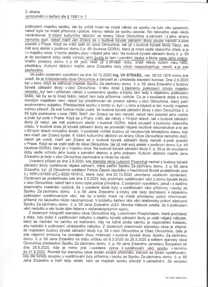 Za povšimnutí jistě stojí, že k žádné škodě údajně nedošlo - přesto se Spolek za záchranu domu Jana Zrzavého musí domluvit se "soukromým vlastníkem", pokud bude chtít památky po malíři zpět.