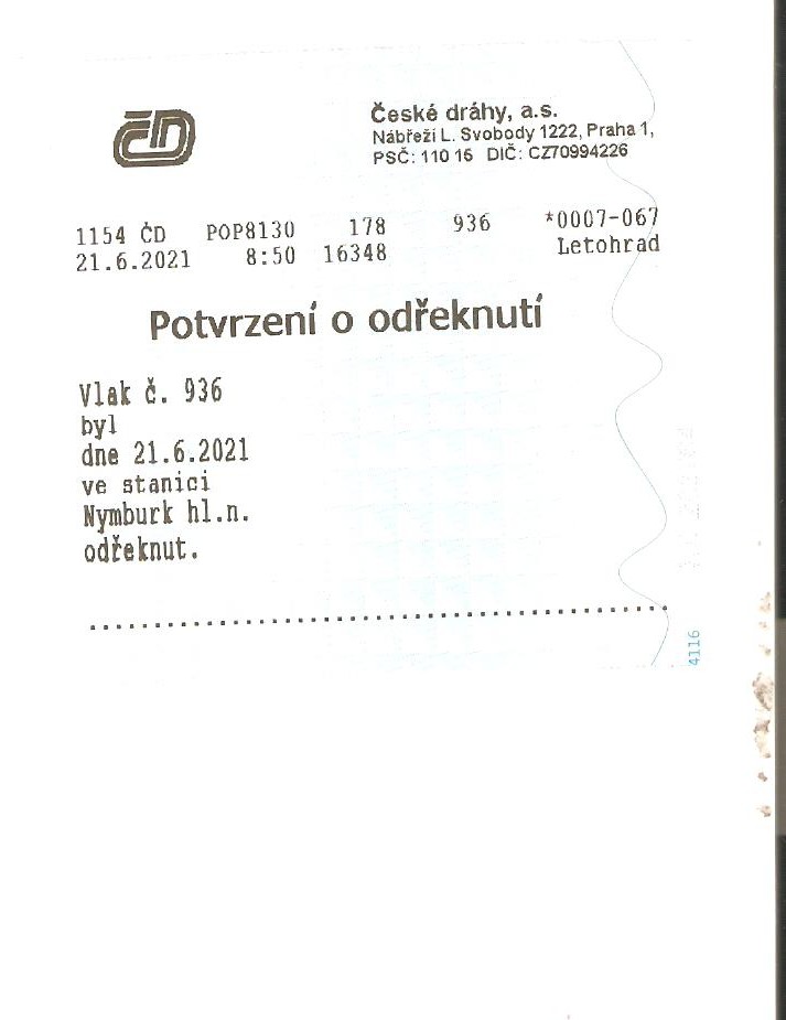 K incidentu ze dne 21. 6. 2021 můžeme pouze potvrdit, že vlak R 936 přijel do stanice Praha hlavní nádraží se zpožděním 92 minut. Příčinou byla závada na hnacím vozidle. Dle doloženého jízdního dokladu (PID) Vám nárok na odškodnění nevzniká.