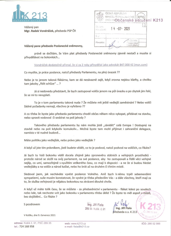 Dopis předsedovi Parlamentu v souvislosti s jeho "vedlejšáky" :